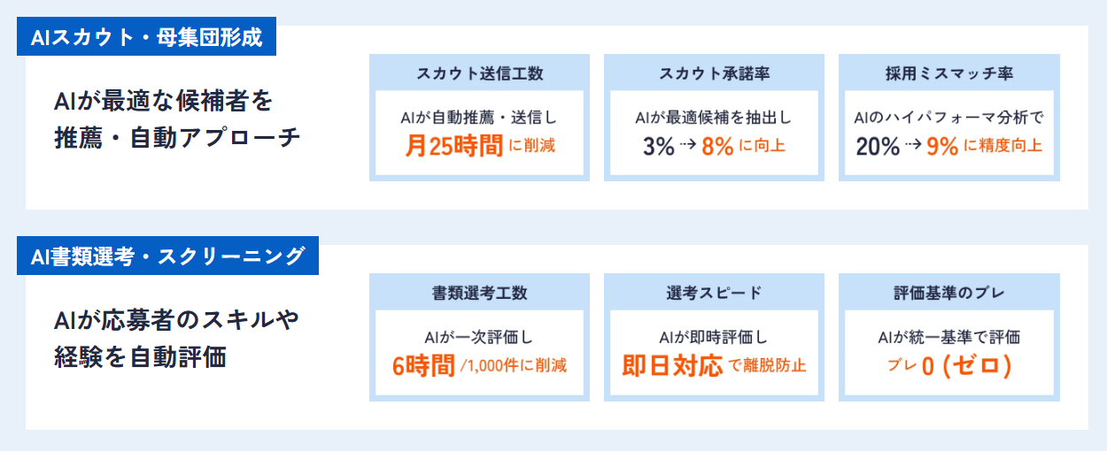 AIによって、スカウト・母集団形成・AI書類選考・スクリーニングのプロセスの効率化を実現します。