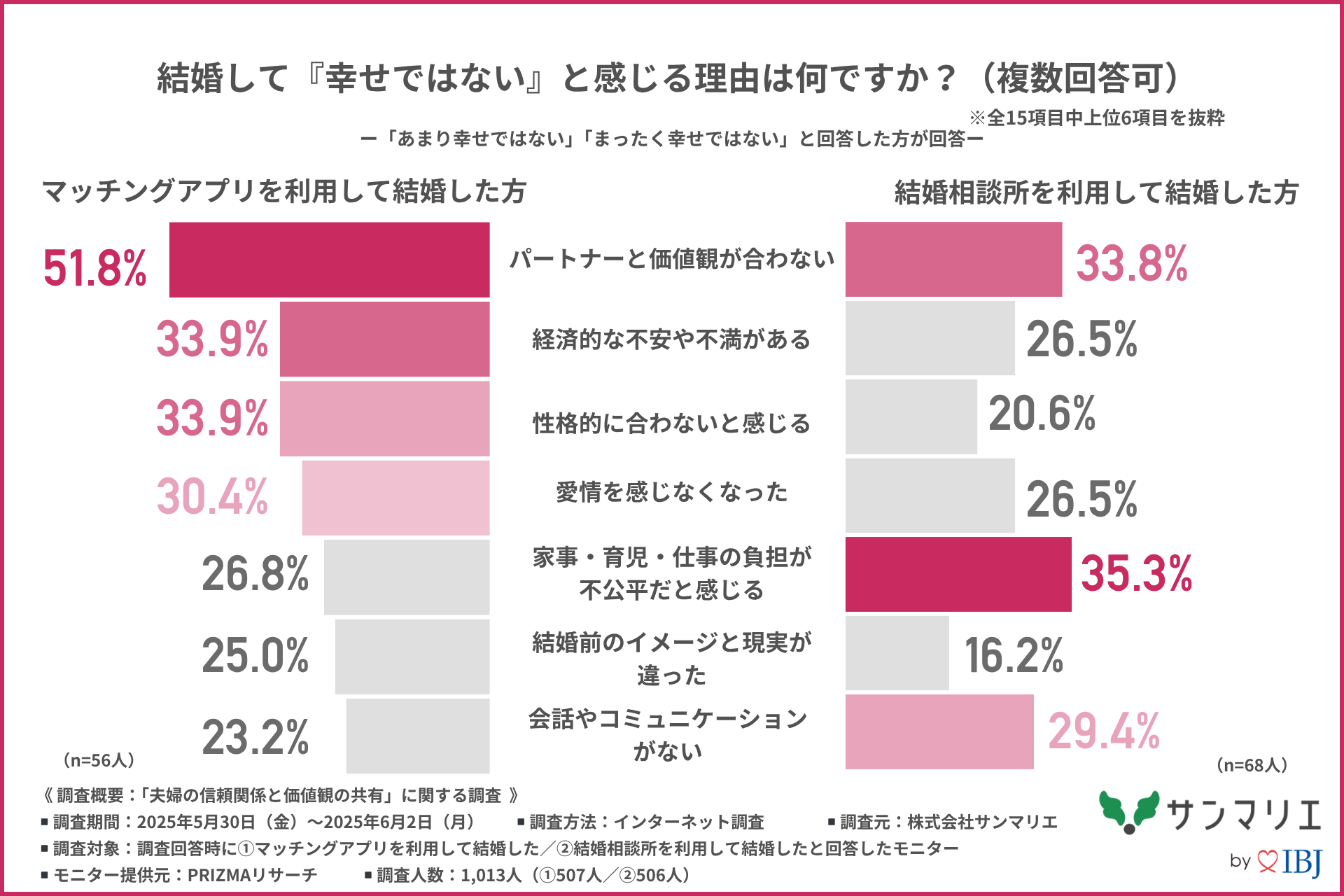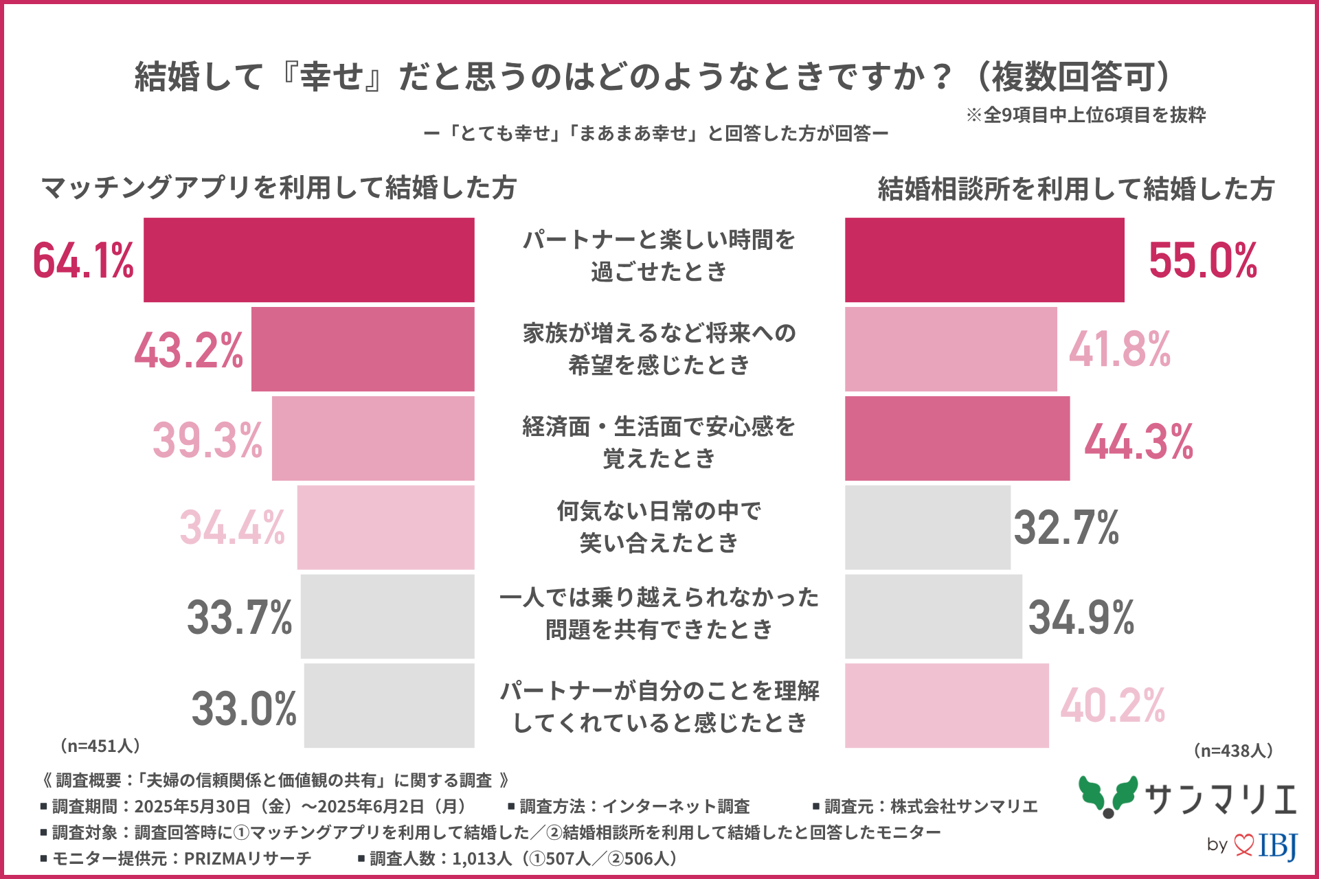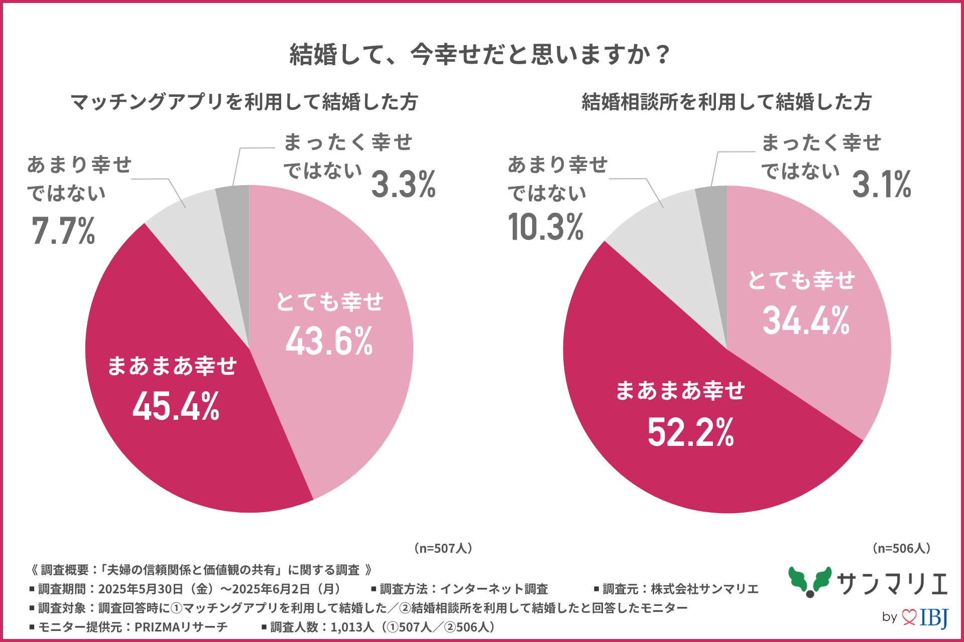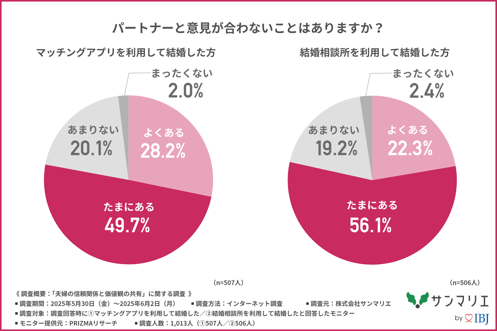 そこで今回、株式会社サンマリエ( https://www.sunmarie.co.jp/ )は、(1)マッチングアプリを利用して結婚した方507名/(2)結婚相談所を利用して結婚した方506名を対象に、「夫婦の信頼関係と価値観の共有」に関する調査を行いました。