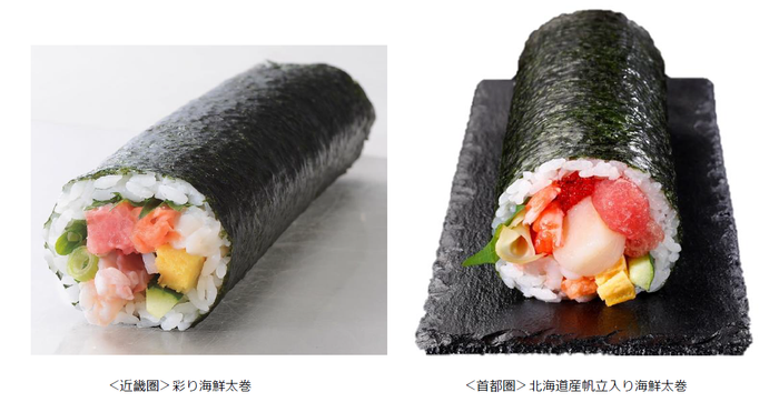 近畿圏では海老・たたきまぐろ・サーモンなど5種類の海鮮がたっぷりと入った「彩り海鮮太巻」など最大26種類の恵方巻を、首都圏では北海道産帆立・まぐろ・ねぎとろ・サーモンなど海鮮がたっぷり入った「北海道産帆立入り海鮮太巻」など、最大13種類の恵方巻をバリエーション豊富に取りそろえます。