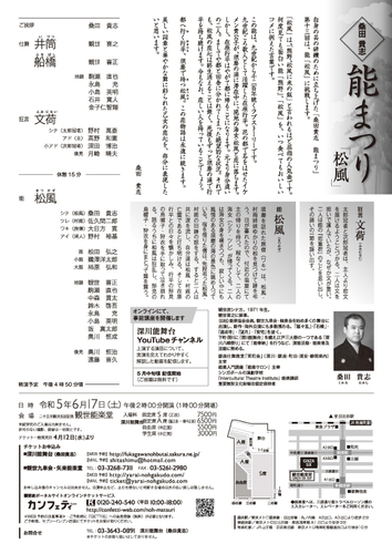 深川能舞台『桑田貴志 能まつり「松風」』が2023年6月17日 (土)に二十五世観世左近記念観世能楽堂(東京都中央区銀座6-10-1GINZA SIX 地下3階)にて上演されます。