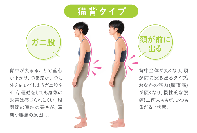 骨盤が前に傾いていると反り腰、後ろに傾いていると猫背になりやすく、それぞれ腰に異なる負担をかけています。
