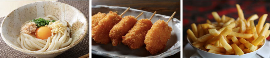 揚げたてさくさくの揚げ物や、出汁にこだわったおでん、お腹を満たすうどんなど、日本酒にあう美味しい食事やおつまみもご用意しています。一般的なイメージの日本酒のおつまみはもちろん、日本酒を知っているからこそ「合う」フードをぜひご堪能ください。