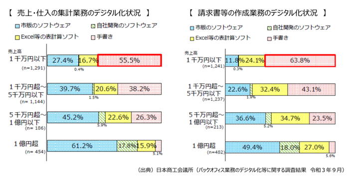 人手不足や市場縮小に対応するために、中小企業の生産性向上は不可欠であり、その鍵はデジタル活用です。当所が実施した調査でも、業務プロセスの効率化や営業力の強化といった経営課題について、IT投資により解決を望む事業者が多いことが分かりました。 また、今年10月から導入される消費税インボイス制度へ的確に対応するには、バックオフィス業務のデジタル化が求められていますが、小規模の事業者の半数以上で、デジタル化が進んでいない状況です。