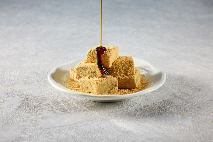 この生わらび餅の魅力は、何よりもその驚きの食感にあります。希少な本わらび粉を使いながら、独自の配合と製法により、通常のわらび餅とは、ふわりと異なるとろける口どけを実現しました。素材選びにも妥協はありません。国産の厳選わらび粉と高純度の和三盆糖を使用し、香ばしい京きな粉で仕上げることで、上品な風味を引き出しています。さらに黒蜜をかけることで、深いコクと甘みが広がり、一口ごとに至福の味わいを楽しめます。