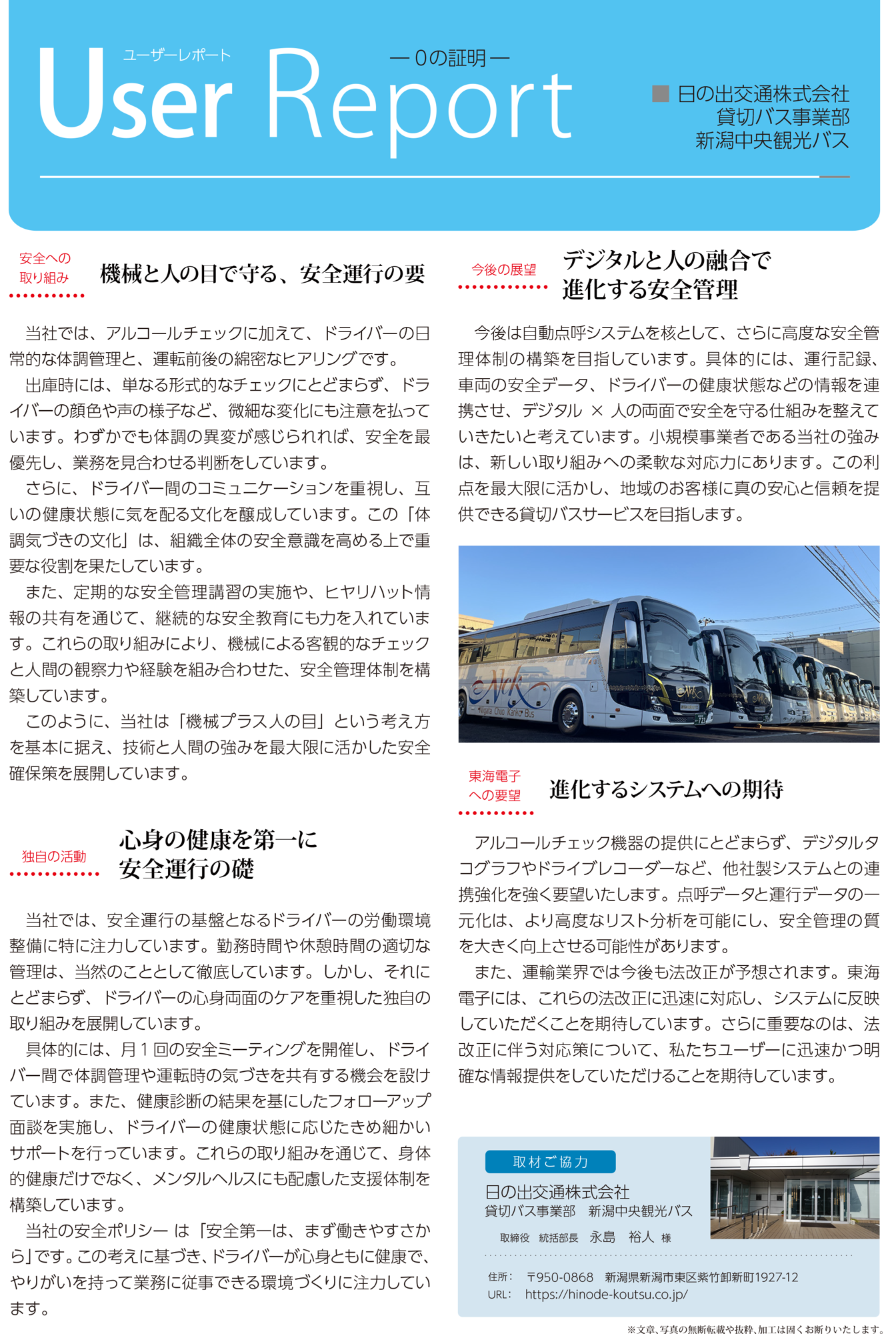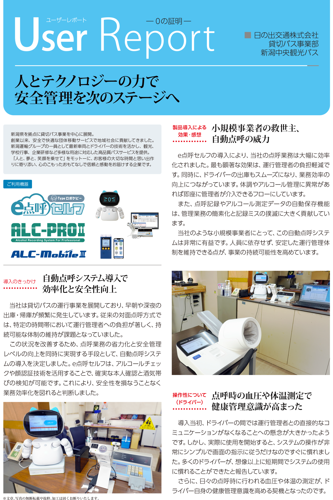 アルコール検知システム、点呼システム、運行管理システム、安全運転管理システムを開発・販売する東海電子株式会社(本社:静岡県富士市、代表取締役:杉本哲也)は、クラウド自動点呼システム「e点呼セルフ Typeロボケビー」を導入した日の出交通株式会社(貸切バス事業部 新潟中央観光バス)様に取材を行い、その内容を導入事例レポートとして公開しました。