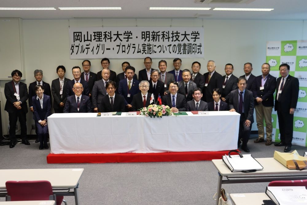半導体分野を中心とした教育連携を目指し、岡山理科大学は台湾の明新科技大学と10月23日、両大学で学士の学位取得を可能にするダブルディグリー・プログラム実施に関する覚書を調印しました。理大は1984年に明新科技大学(当時は明新工業専科学校)と教育交流協定を締結しており、40年以上経過したことから昨年9月に加計学園と明新科技大学で同協定を再締結。今回の覚書はその協力関係をさらに強化していくのが目的です。