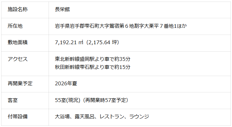 株式会社NBIホールディングス(本社:東京都港区、代表取締役:金谷 隆行、(以下「当社」))は、当社の子会社である株式会社NBI地方創生インベストメントを通じ、岩手県鶯宿温泉の長栄館(以下「本物件」)を取得するため不動産売買契約を締結しましたのでお知らせいたします。