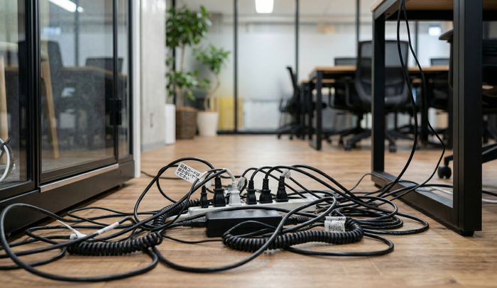 ノートPCやスマートフォン、モニターなど、現代の働き方において電源の確保は死活問題です。動線を塞ぐような延長コードのタコ足配線は、美観を損ねるだけでなく火災や転倒のリスクも高めます。床下配線(OAフロア)の再構築や、デスクの配置に合わせた適切な電源タップの増設など、根本的な電気工事が必要です。