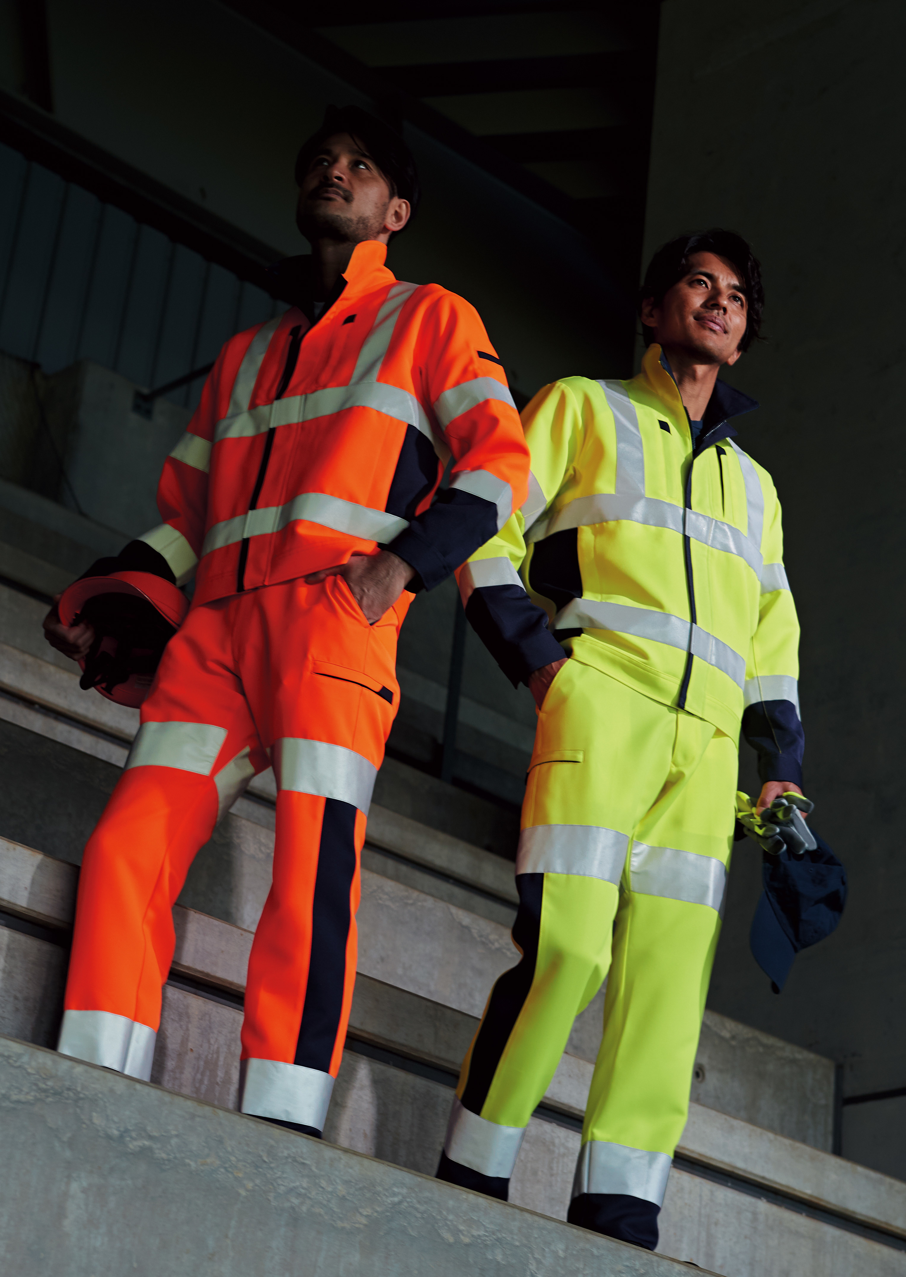 建設現場や道路工事の現場など、工事現場では一定割合で事故が発生してしまうことがあります。特に夜間の工事では、そこに作業員が居ることを視認出来ないことにより事故率を高めてしまう可能性があります。Asahichoでは長年高視認性安全服を製造する中で、どの様な際に事故が発生しやすいかを研究した結果、作業員が屈んだ姿勢で反射材が隠れてしまうケースや高所から見下ろす際に反射材が見えにくいことが事故に繋がる可能性があると想定し、反射材の位置を再検討すると共に、着心地やデザインを改良した新型の高視認性安全服を開発いたしました。