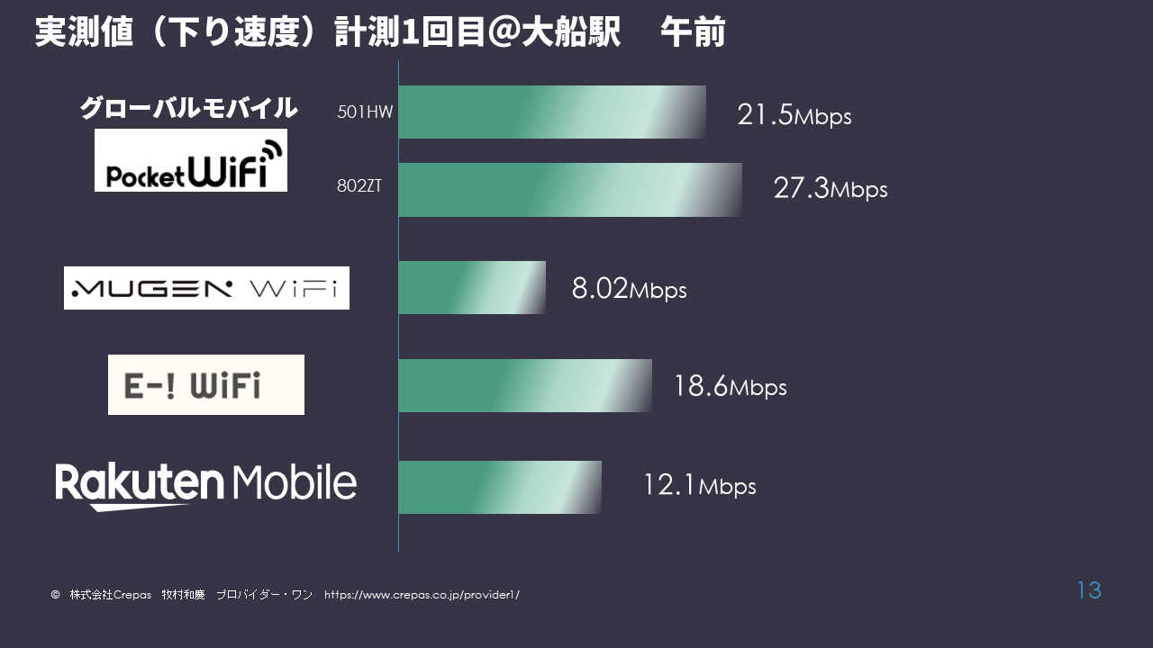 計測1回目の大船駅ではグローバイルモバイルのポケットWiFi2機種の速度がいずれの機種よりも速い結果となりました。