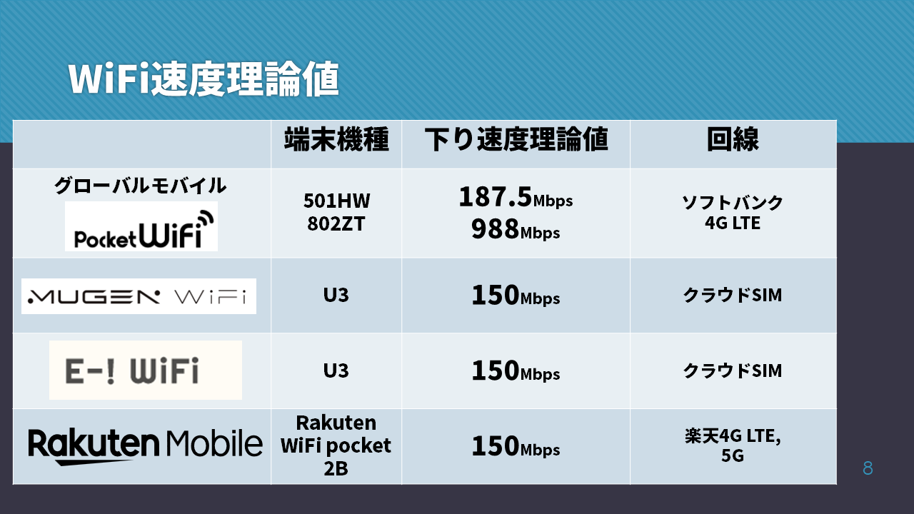 今回、同時に4事業者5機種の速度を計測し、上記の考察を踏まえ、最速のモバイルWiFiは「グローバルモバイルのポケットWiFi」がNo.1という結論に至りました。