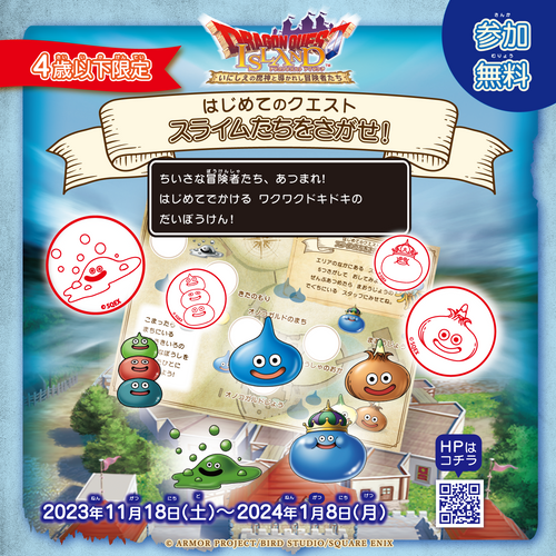 本イベントでは、期間中に「ドラゴンクエスト アイランド」へ入場された4歳以下のお子様を対象に「スライムたちをさがせ!」専用のスタンプシートをお配りいたします。アトラクション内に設置された5ヵ所のスタンプ台を探しながら、さまざまなスライムたちが描かれたスタンプを集めるクエストに挑戦することができます。専用の台紙に全てのスタンプを集めた方には、クリア特典として「ドラゴンクエスト アイランド オリジナル認定ステッカー」をプレゼント!