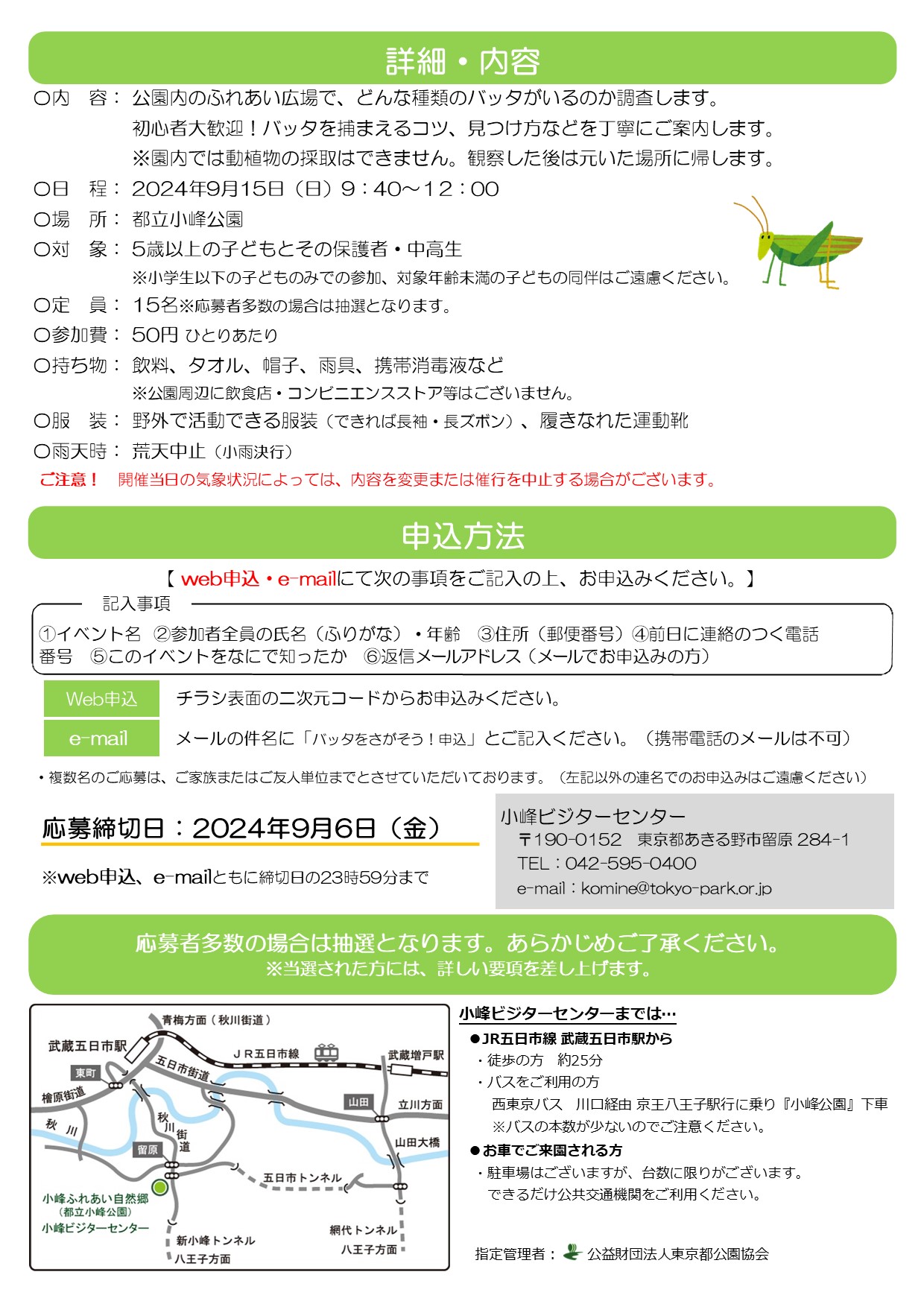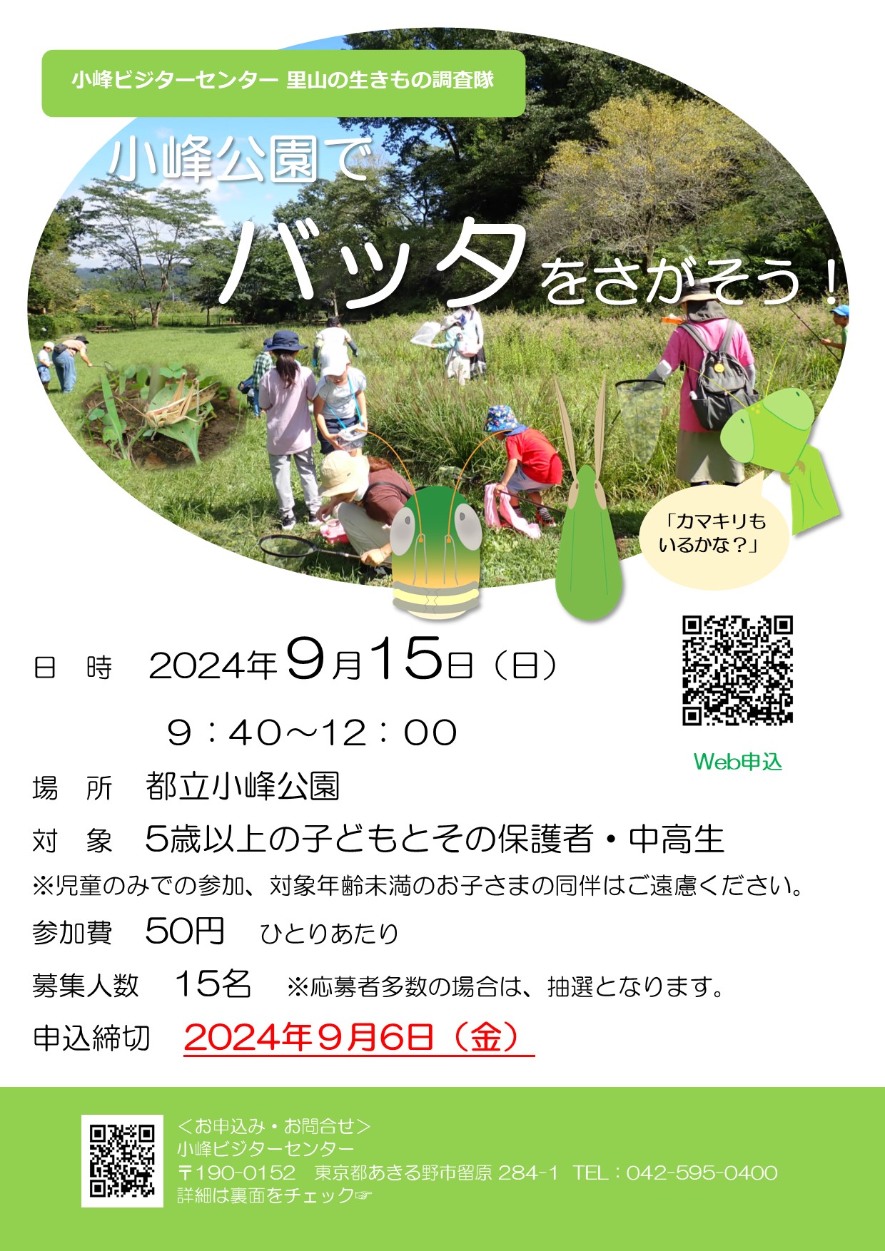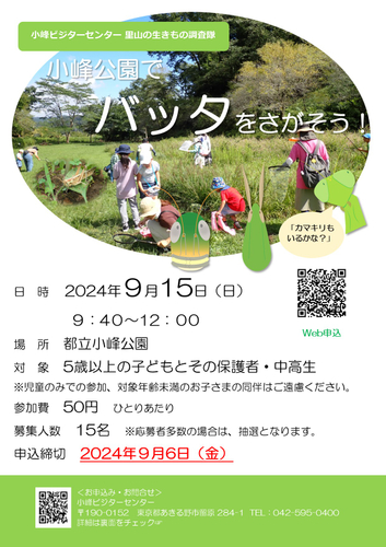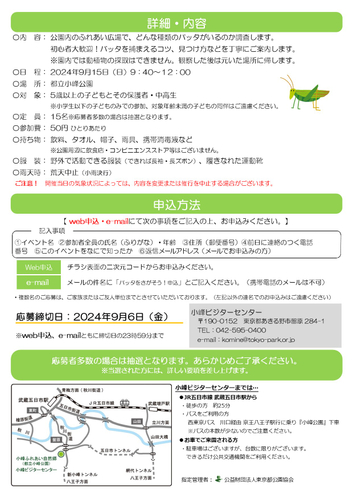 小峰公園では9月15日(日)に「小峰公園でバッタをさがそう!」を開催します。
