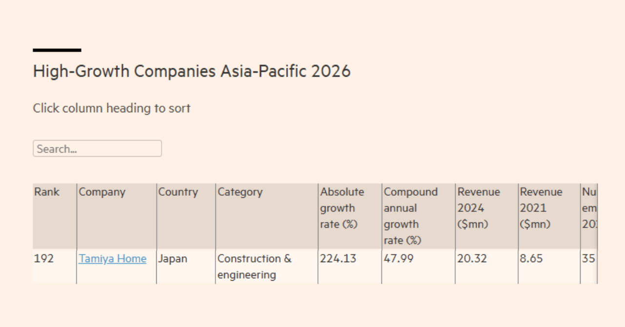 一都三県を中心に「かいたい」「不動産」「リノベーション」を展開する株式会社タミヤホーム(本社:埼玉県所沢市、代表取締役社長:田宮 明彦)は、英国の経済紙『Financial Times』と、世界最大級の統計調査データプラットフォーム『Statista』が共同で実施した調査「High-Growth Companies Asia-Pacific 2026(アジア太平洋地域における急成長企業ランキング2026)」において、日本の建設部門で一位に選出されたことをお知らせいたします。