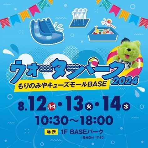 もりのみやキューズモールBASEでは、猛暑の夏でも全力で楽しめる「ウォーターパーク2024」を今年も開催します。1階の「BASEパーク」に、巨大なウォータースライダー、床噴水、縁日でも定番の人形すくいが期間限定で登場し、家族みんなで思う存分、水あそびが楽しめます。そのほか、屋台の出店やステージでのパフォーマンスを行う夏祭り「第4回ココロ・カラダQ's祭り」を開催します。
