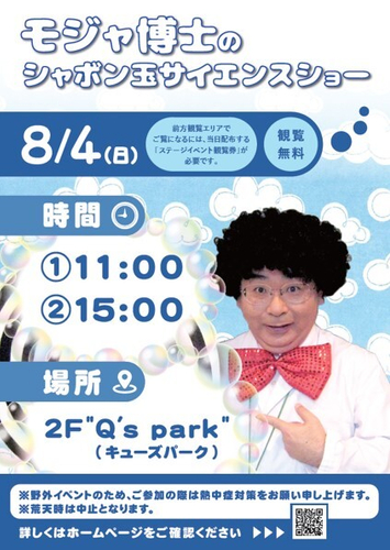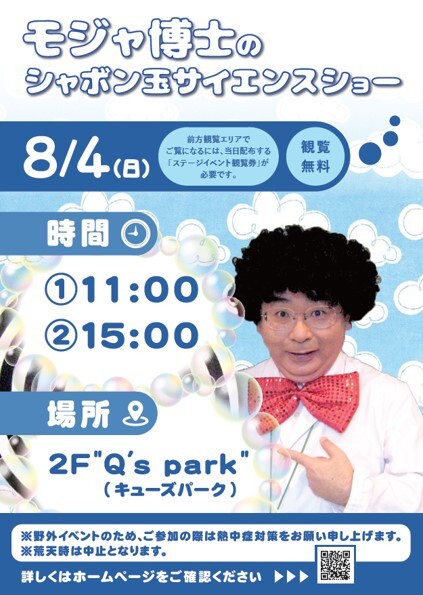 内 容:シャボン玉博士「モジャ博士」による「シャボン玉サイエンスショー」を開催します。大きな蛇のシャボン玉やソフトクリームのシャボン玉、煙が中に入っているゴーストシャボン玉など、普段とは違う多種多様なシャボン玉をショー形式で楽しむことができます。