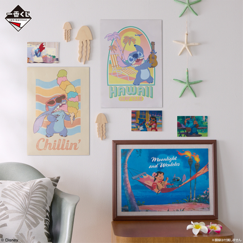 本商品は、のんびり満喫する夏をテーマにした「リロ&スティッチ」の一番くじです。カードスタンドフィギュア、ぬいぐるみ、ハンモック風タオル、その他雑貨などをラインナップしました。