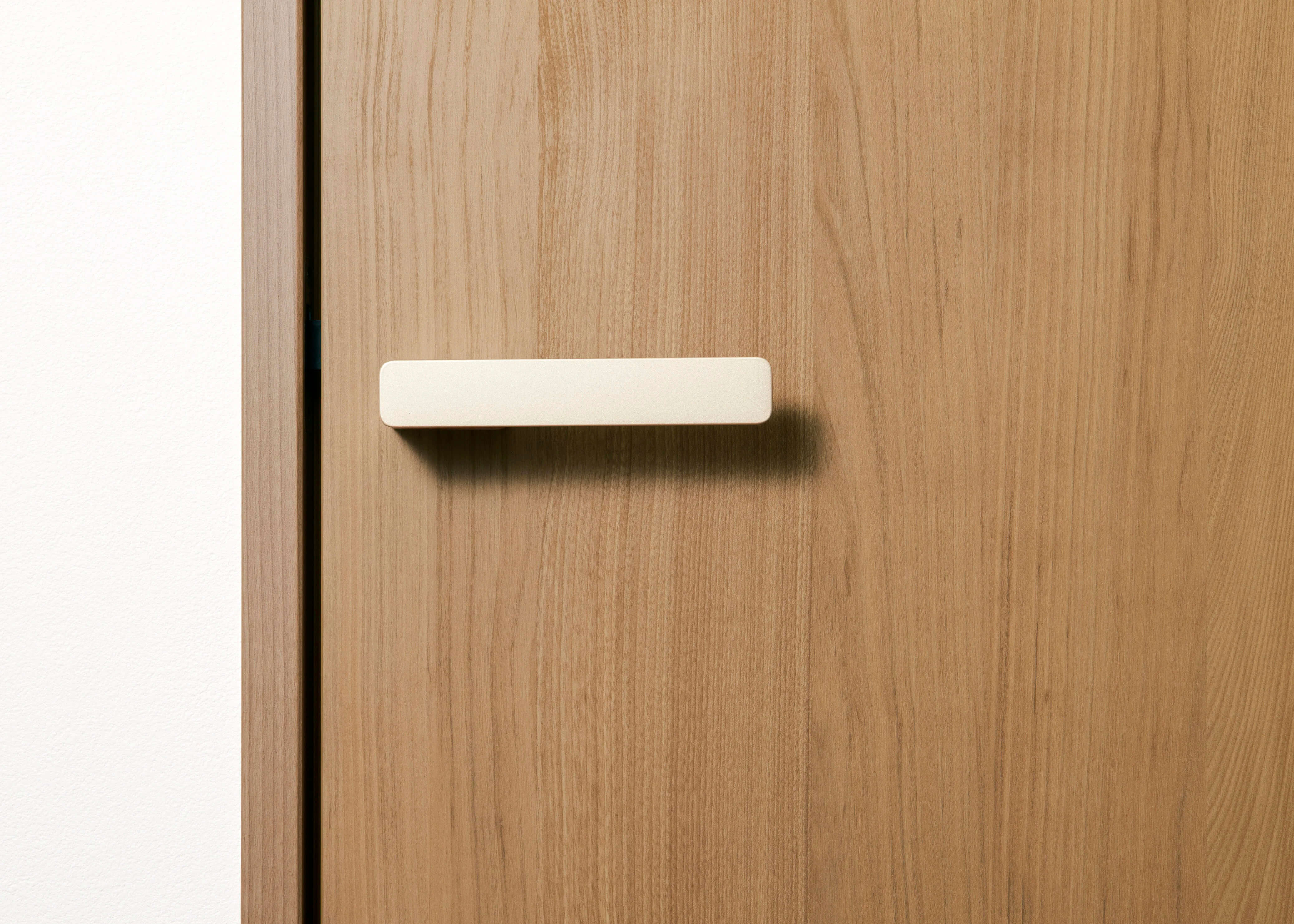 マグネット式のラッチでやさしい操作感に。ハンドルを少し動かすだけで開くショートストローク。見た目も美しく、スッと閉まります。