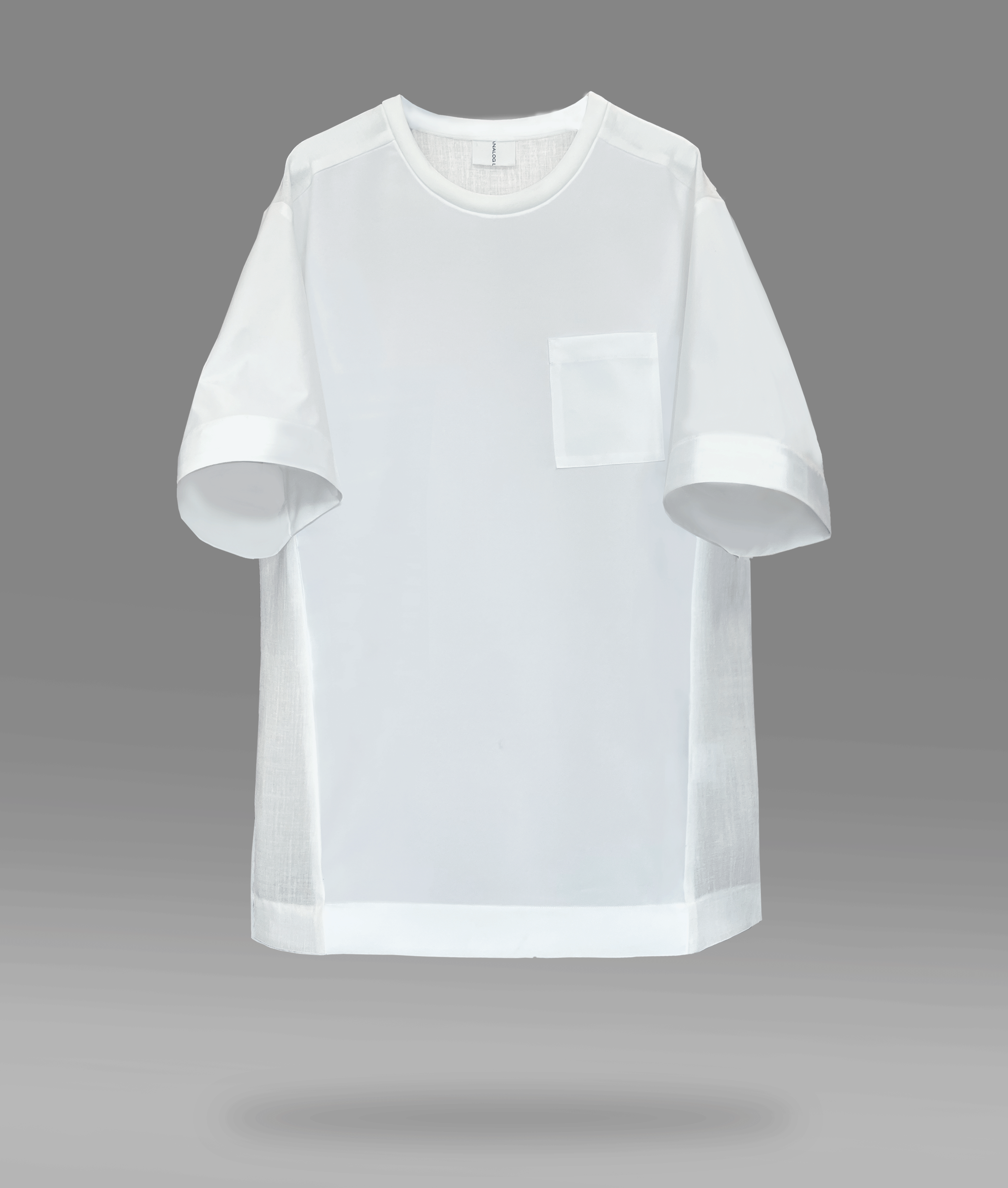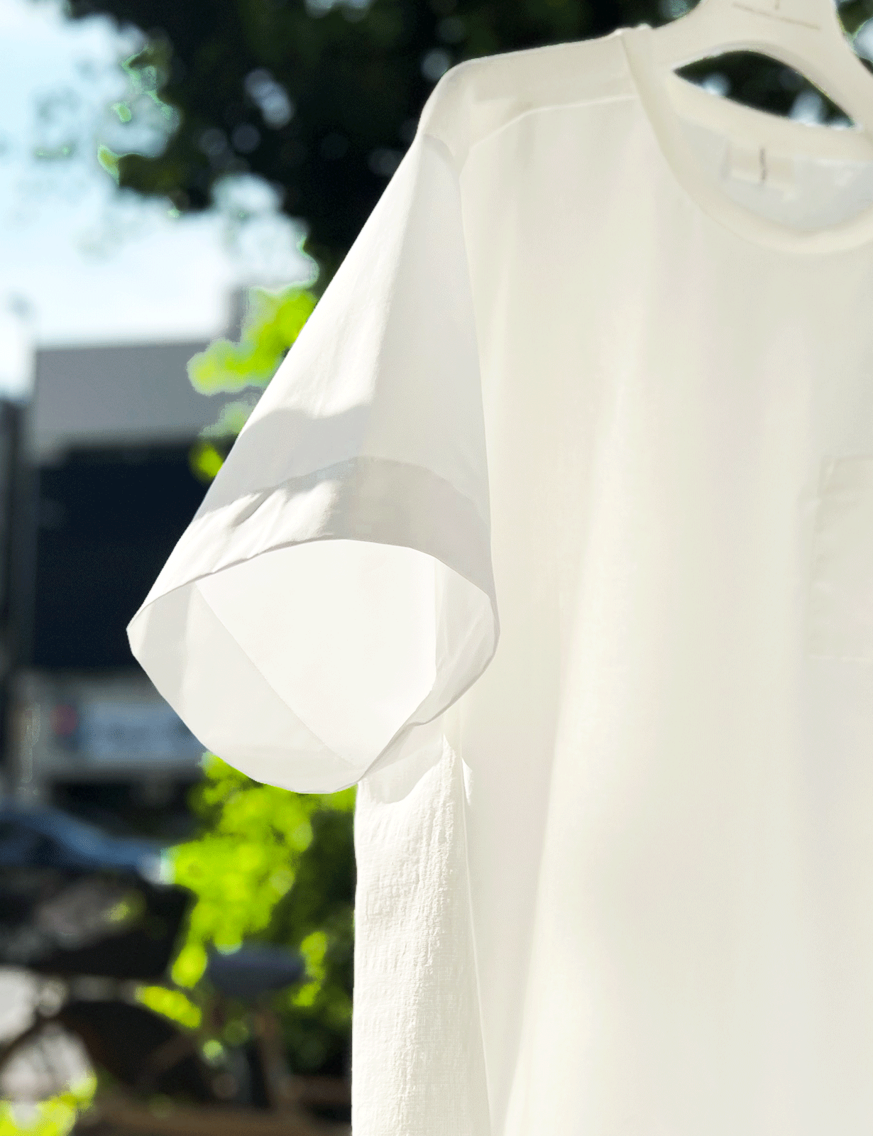 白Tシャツは誕生から100年間、殆ど進化していません。それに比べ地球環境は温暖化など大きく変化しています。そんな状況を踏まえて、この道45年の縫製職人さんと、25年のデザイナ一が「この猛暑を軽減する洋服をつくり、エアコンに頼りすぎない暮らしをつくる」と今までの経験と知識を集結して一緒に制作しました。