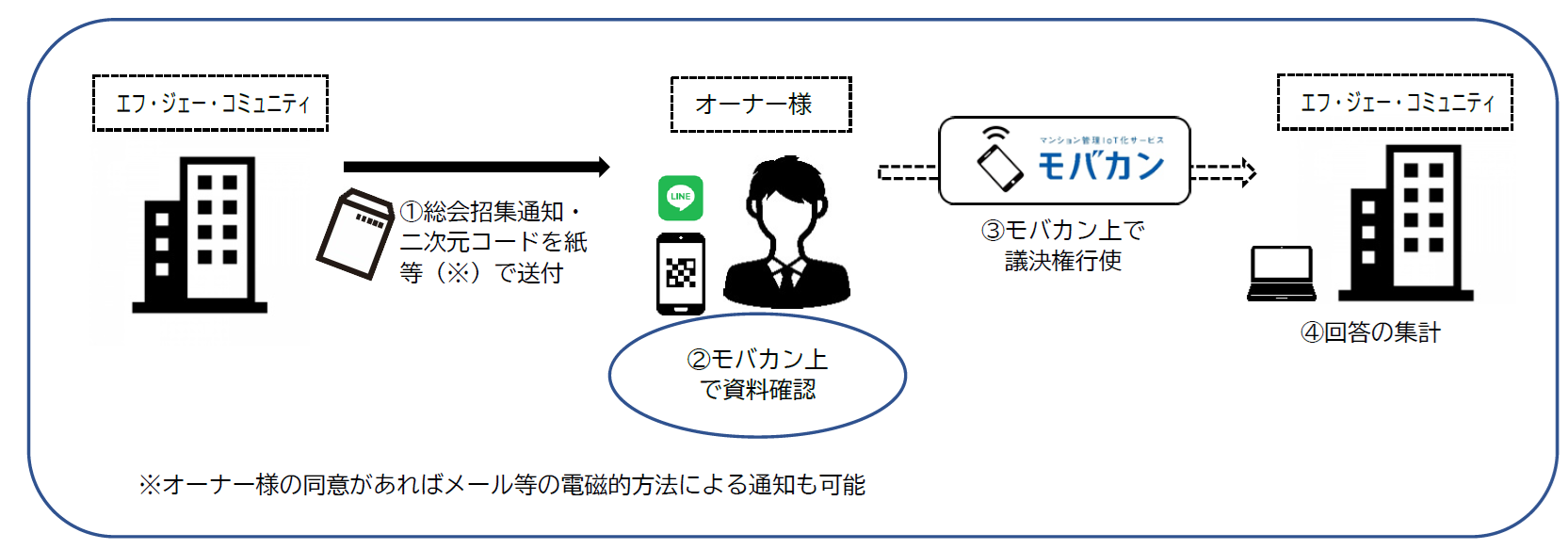 ◆「モバカン」とは、マンション管理のDX推進に特化したサービスであり、この度「モバカン」で導入する「掲示板・書庫サービス」は、管理組合の総会案内・議決権行使書類等をLINE(※)ミニアプリに配信するものであります。配信された情報は各住戸に発行する二次元コードをスマートフォンから読み込み、LINEを通じて確認することができます。