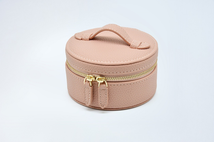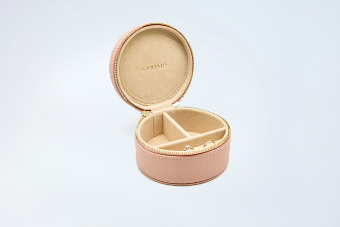 アイプリモオリジナルの、レザー調のラウンドジュエリーケース。