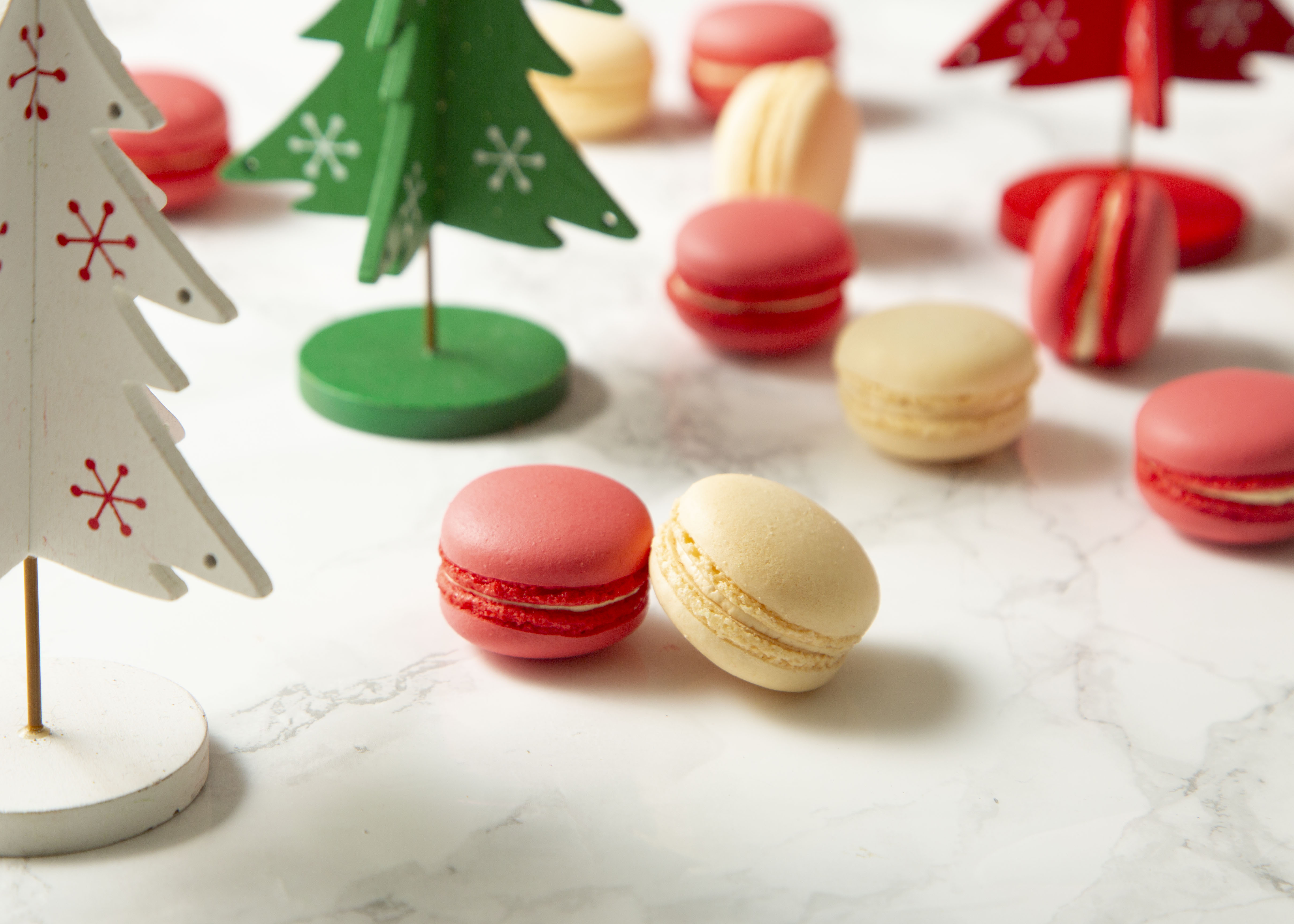 クリスマスフェア開催期間中、WEBにてディナータイムにご予約いただいたお客さまには、クリスマスカラーで仕上げた、自家製マカロンを各色1つずつプレゼントさせていただきます。