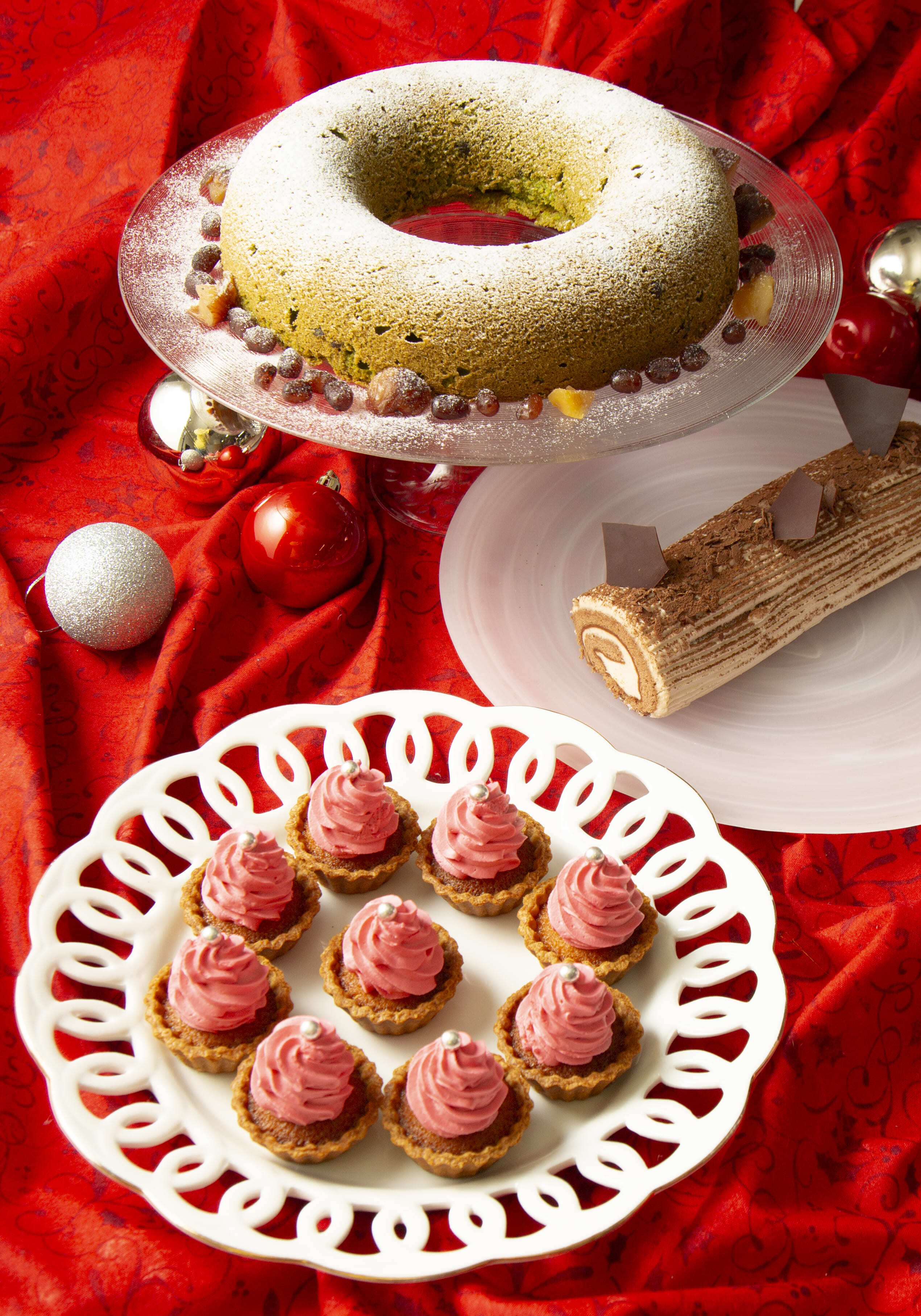 提供メニュー(画像上から):抹茶のエンゼル、ブッシュ・ド・ノエル、サンタの帽子タルト、ローストチキン