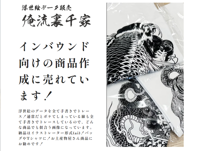 さらに、「俺流裏千家」では、浮世絵データを利用したオリジナルグッズの制作にも個別に対応しています。Tシャツ、バッグ、ポスターなど、1枚からでもリーズナブルな価格で提供し、個人や小規模店舗でも手軽にグッズを制作することが可能です。これにより、オリジナルデザインの魅力を最大限に活かした商品を展開することができます。