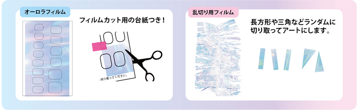 【その1】うるうる氷ネイルができるオーロラフィルムと、乱切り用フィルムをセットにしたこと。2種類のフィルムは厚みがそれぞれ違い、厚みによってニュアンスの違うネイルデザインができます。ワンパターンになりがちなオーロラフィルムのネイルデザインに変化をつけることができます。