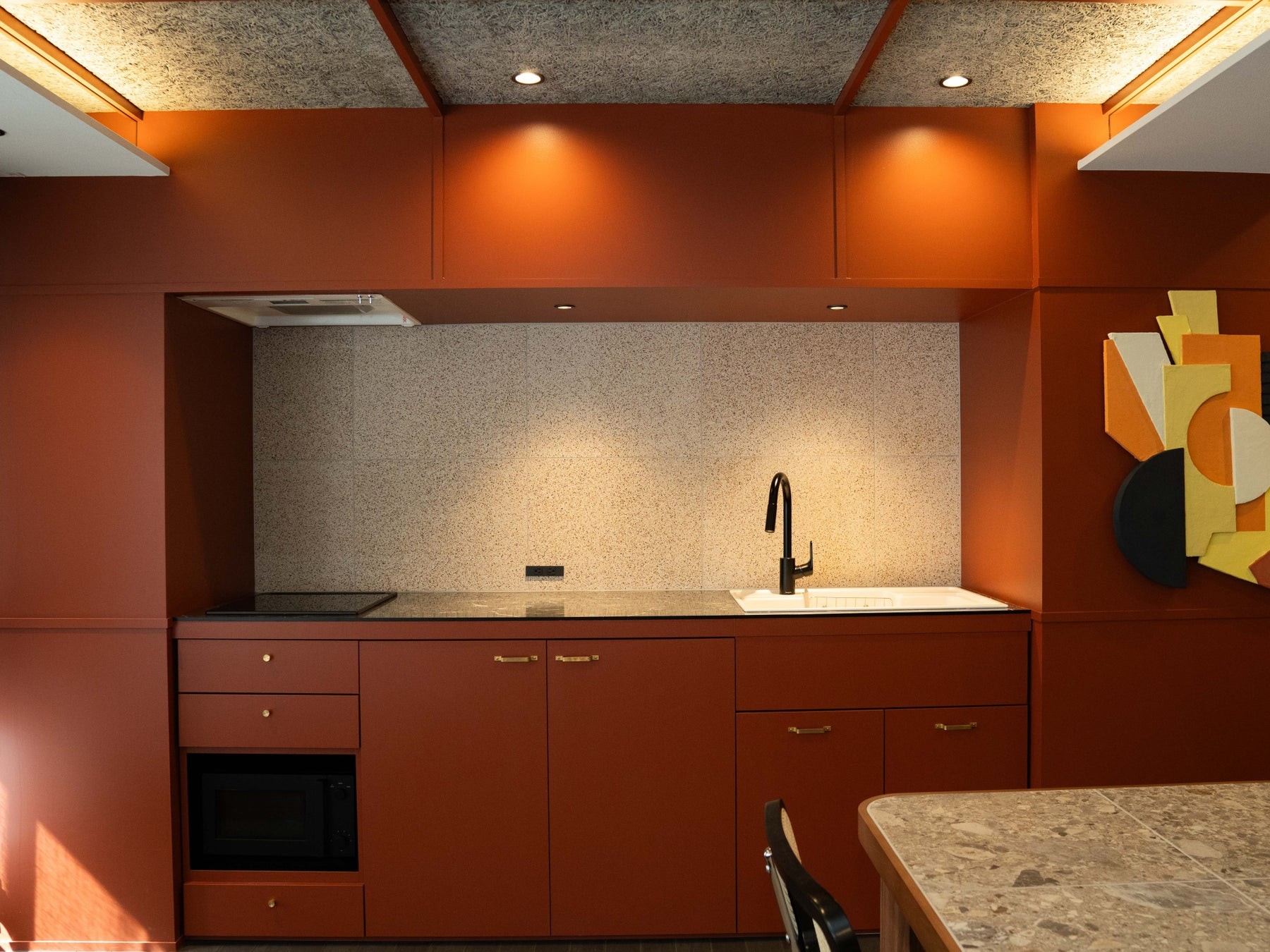 64㎡の広さを確保し、最大6名まで滞在可能。ミッドセンチュリーモダンをベースとした華やかで活気ある色彩に、格子天井の温もりや無骨なブロックタイルの質感が調和するデザインです。ダイニングやラウンジを囲むゾーニングが自然と会話を弾ませ、旅の時間を豊かに育みます。