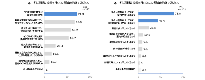 また、「冬に家で窓開け換気を行いたい」人の7割以上が「コロナ対策で換気が重要だと思うから」を挙げており、感染予防対策として換気に対する関心は依然として高いことがわかります。一方で、「冬に家で窓開け換気をしたくない」という人の約8割が「寒くなる」、約4割が「暖房の電気代が高くなる」ことを理由に挙げていました。