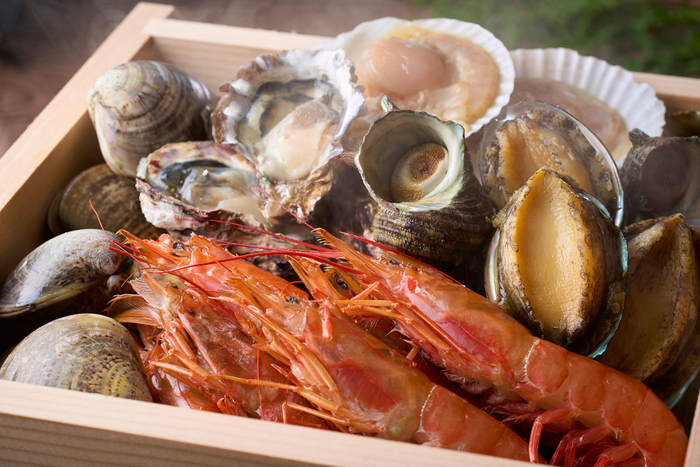 左)お席で蒸したて熱々をお召し上がりいただける海鮮浜蒸し。ホタテやアワビ、サザエ、牡蠣など豊富な魚介類をご用意しております。