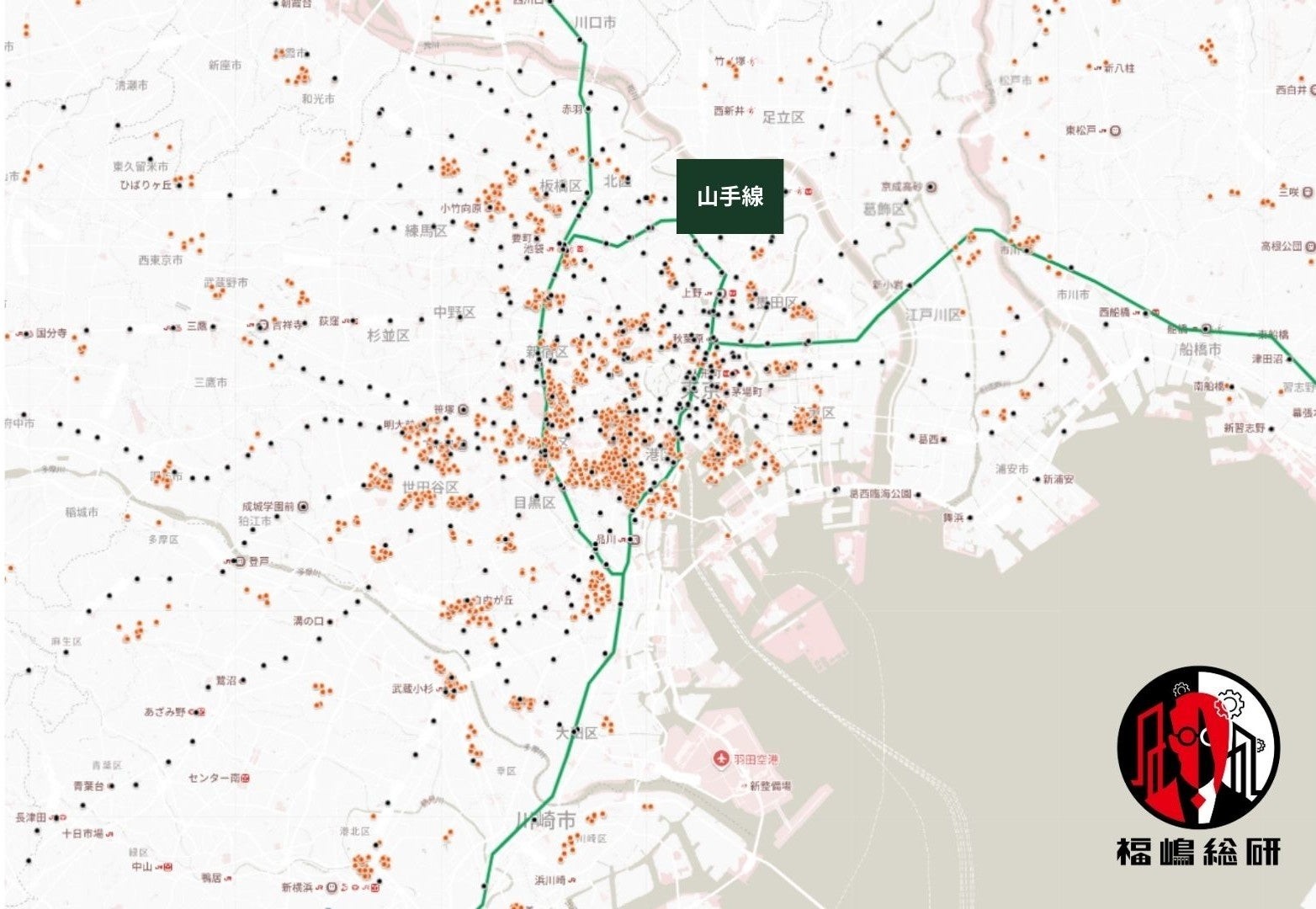 次に、価格動向から資産性を検討してみましょう。図2に示した2024年対2023年のエリア別平均坪単価高騰率では、赤プロット(20%以上の高騰)が集中するエリアが浮き彫りになります。特に山手線の内側は圧倒的に赤の密度が高く、その中でも皇居の西から南にかけての一帯、つまり渋谷区・港区周辺は日本で最も価格の高いエリアに位置付けられます。