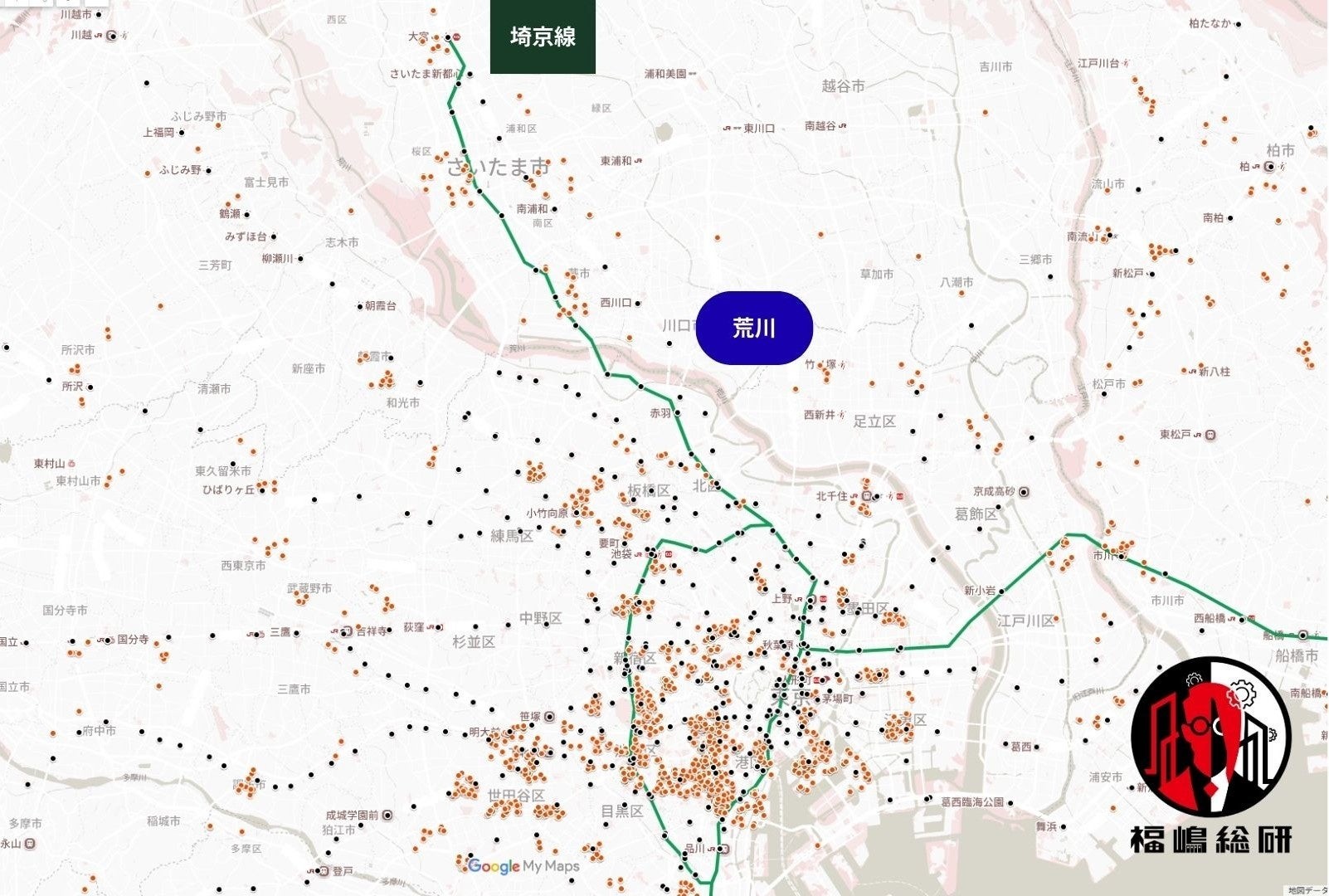 一方で興味深いのは、埼京線沿線の動きです。従来の感覚では、荒川を越えて埼玉県側に入ると都心との距離感から資産性は下がると考えられてきました。しかし実際のデータを見ると、むしろ荒川を越えた方が赤プロットの密度が高まっています。これは非常に特徴的な現象です。