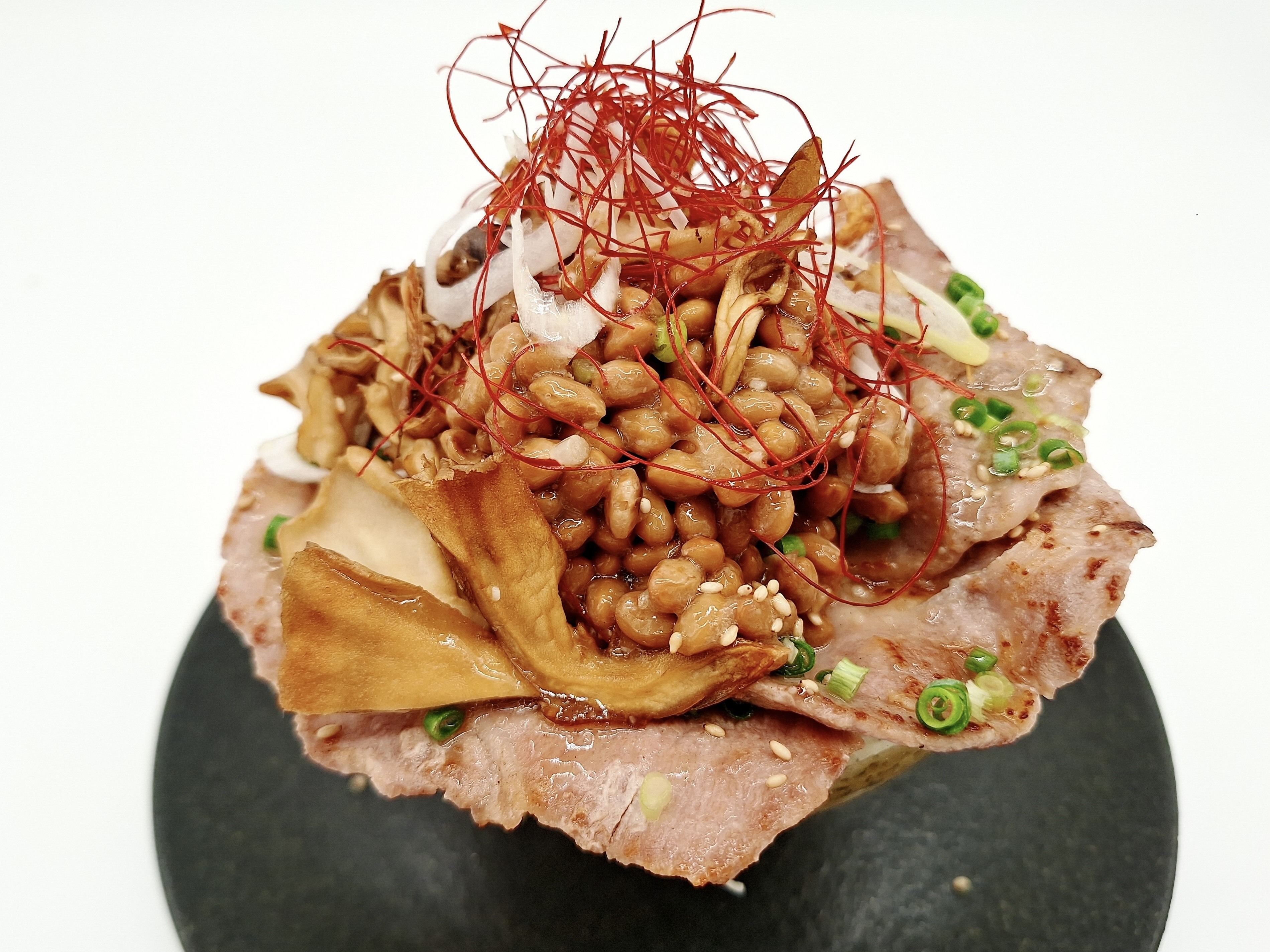 ローズポークに納豆をたっぷり乗せ、旨塩だれでお召し上がりください。