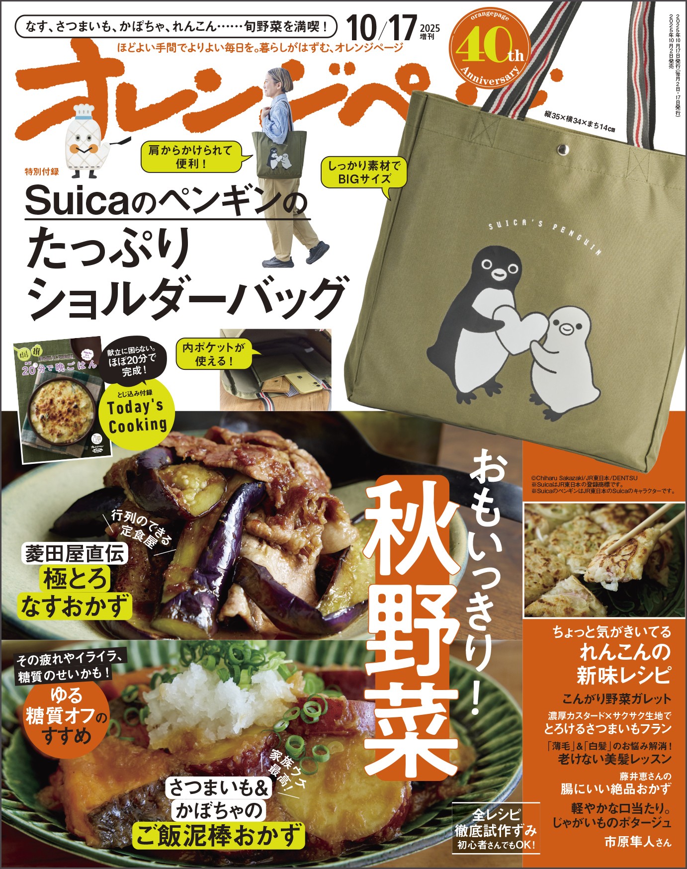 株式会社オレンジページ(東京都港区)が月2回発行する、創刊40周年を迎えた生活情報誌『オレンジページ』。10月2日(木)発売の10月17日号増刊は、特別付録「Suicaのペンギンのたっぷりショルダーバッグ」つき。大きめのサイズで使い勝手抜群のバッグは、数量限定のオリジナルデザイン。全国の書店、一部ネット書店で好評発売中です。また、JRE POINTが使えるJRE MALL内の「オレンジページ shop」でも販売中です。【特別定価1,265円(税込)】