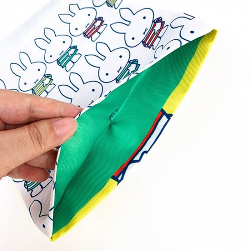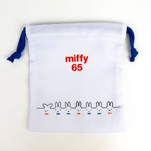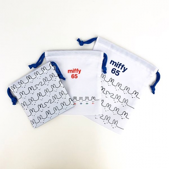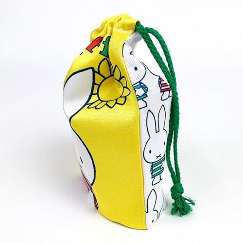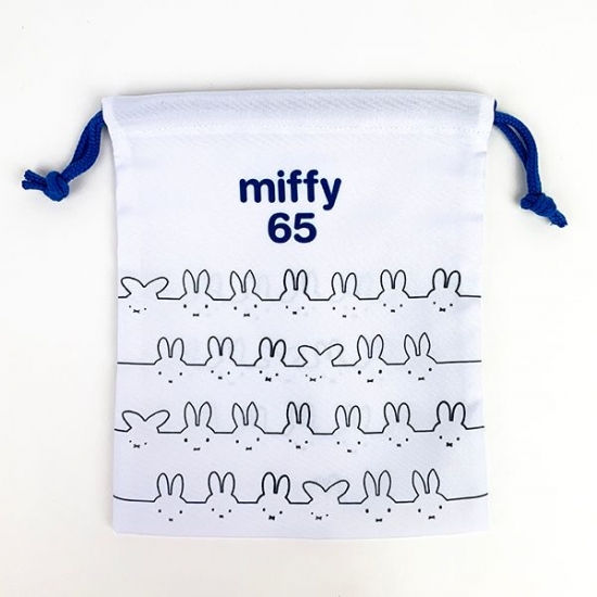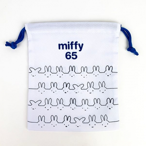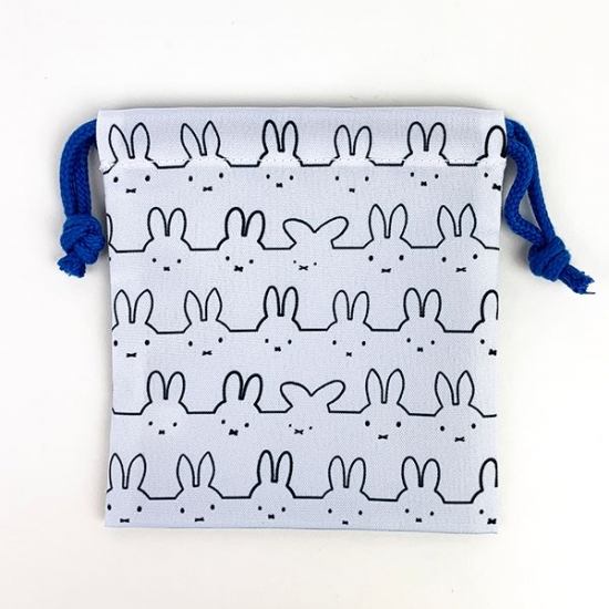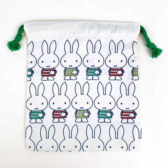 ミッフィー総柄の巾着です。ボーダー柄の洋服を着たミッフィーがかわいい♪