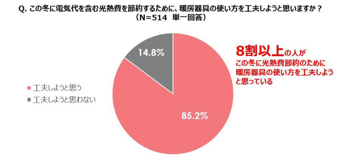 冬本番を迎えるにあたり、この冬に光熱費節約のため暖房器具の使い方を工夫しようと思うか伺ったところ、暖房器具を使用している人のうち85.2%もの人が「工夫しようと思っている」と回答しました。暖房器具による節約・節電方法に多くの人が関心を寄せていると思われます。