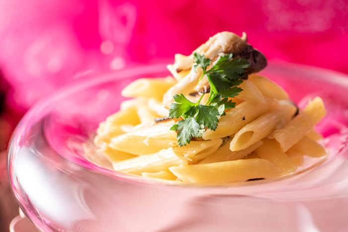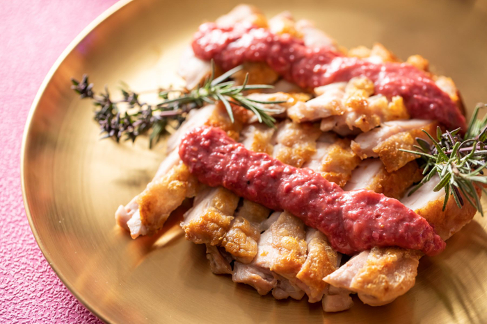 【フード(温製3種)】若鶏のロティ いちごとフランボワーズのコンフィチュール/フライドポテト チリ&レモンスパイス/ズワイガニと茸のペンネペペロンチーノ