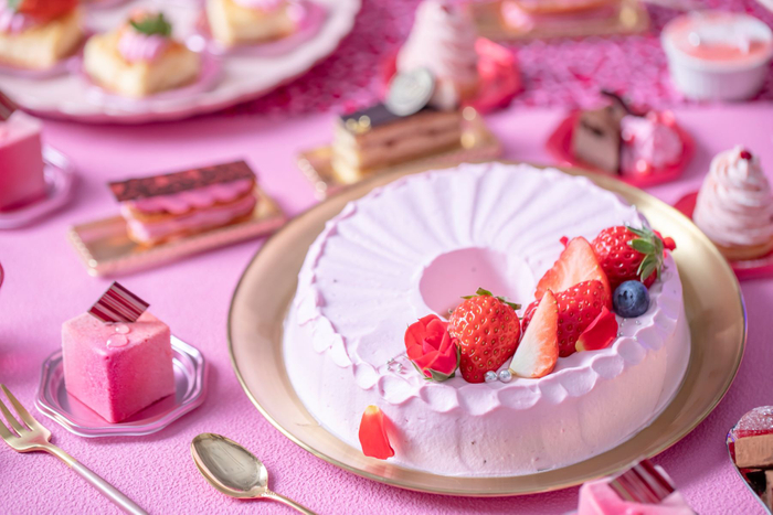 【スイーツ(15種)】ピンクショートケーキ/いちごヨーグルトのシャルロット/シフォンケーキ~薔薇の香り~/自家製いちごソースとルビーショコラのムース/ストロベリーアップルティージュレ/ストロベリービネガージュレとヨーグルトのブランマンジェ/小菓子2種(いちごのパートドフリュイ/コーヒーラムの生チョコ)/いちごのエクレア/いちごのモンブラン/ベイクドチーズケーキ/ガトーショコラ/いちごティラミス/ライチといちごのムース/クラシックオペラ