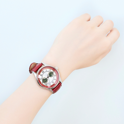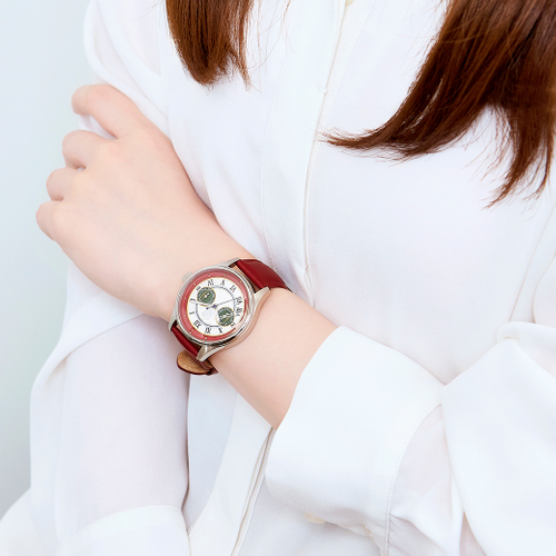 校章やブレザーのボタン、スカートの裾のラインを表現した盤面や、リボン・ネクタイをイメージした青色の秒針など、作品の世界観がふんだんに取り込まれた特別なデザインです。