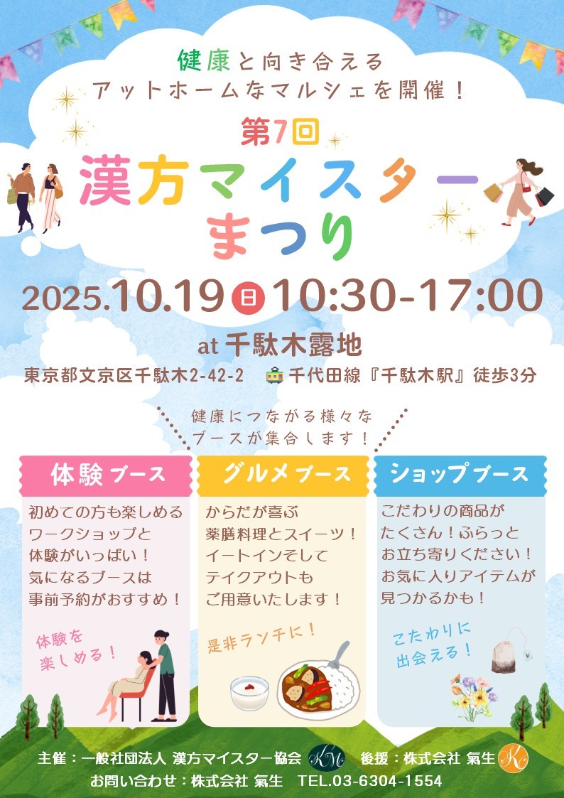 株式会社氣生(本社:東京都豊島区南大塚、代表:久保田佳代)は、2025年10月19日に文京区千駄木で第7回漢方マイスター祭りを開催します。本イベントでは、漢方茶の体験や薬膳料理、健康関連の体験ブースを提供します。