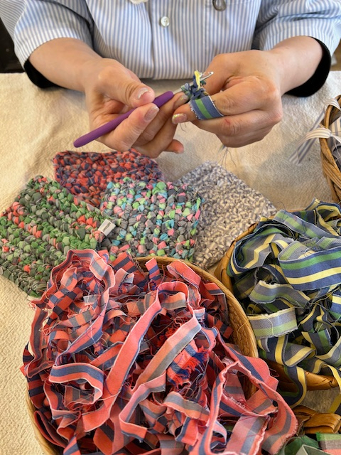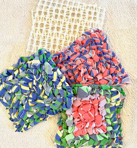 廃棄布を手作業で同じ大きさの布テープに揃え色毎にまとめ、1点1点手作業で編み込み完成させていきます。