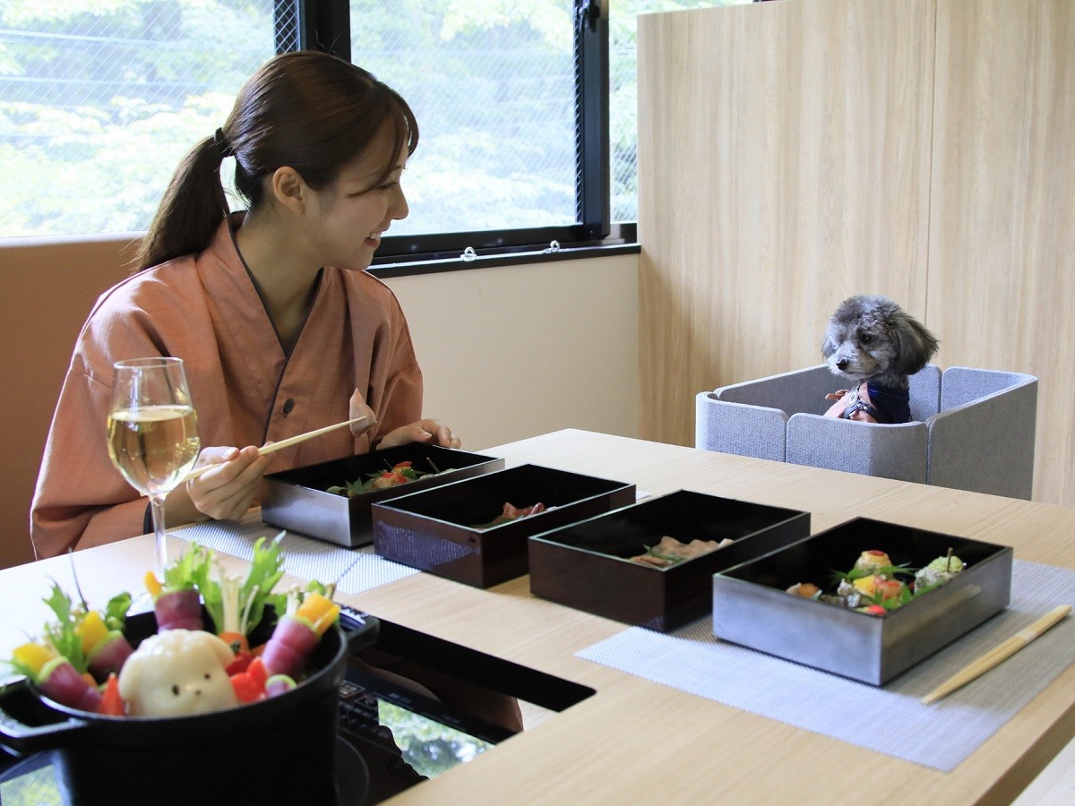 愛犬と同伴OKのレストランにて、ご夕食はお野菜たっぷりの健康お鍋を、朝食は和食をお召し上がりいただけます。また、愛犬専用ビュッフェもあり愛犬も退屈することなくお食事を愉しめます。