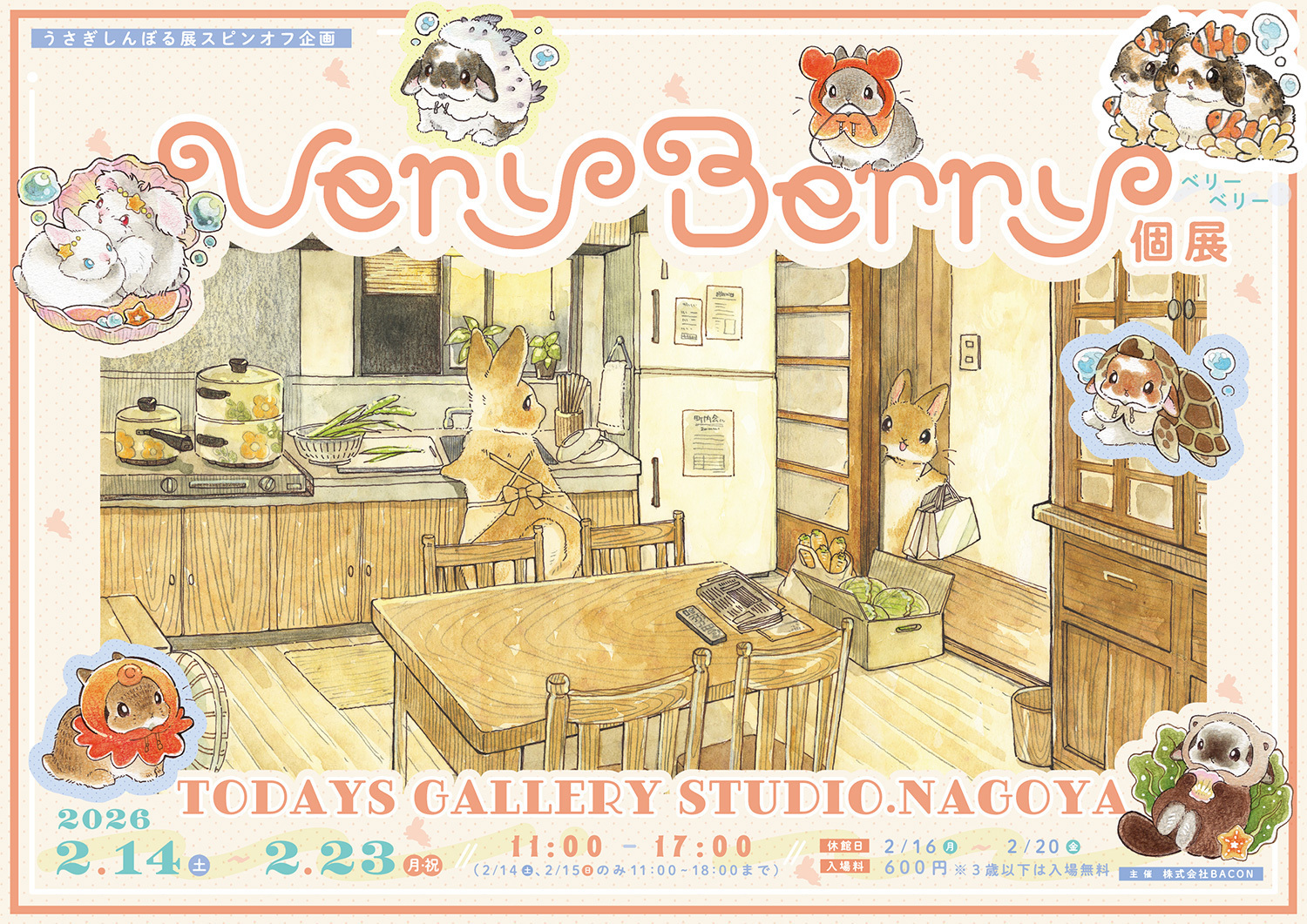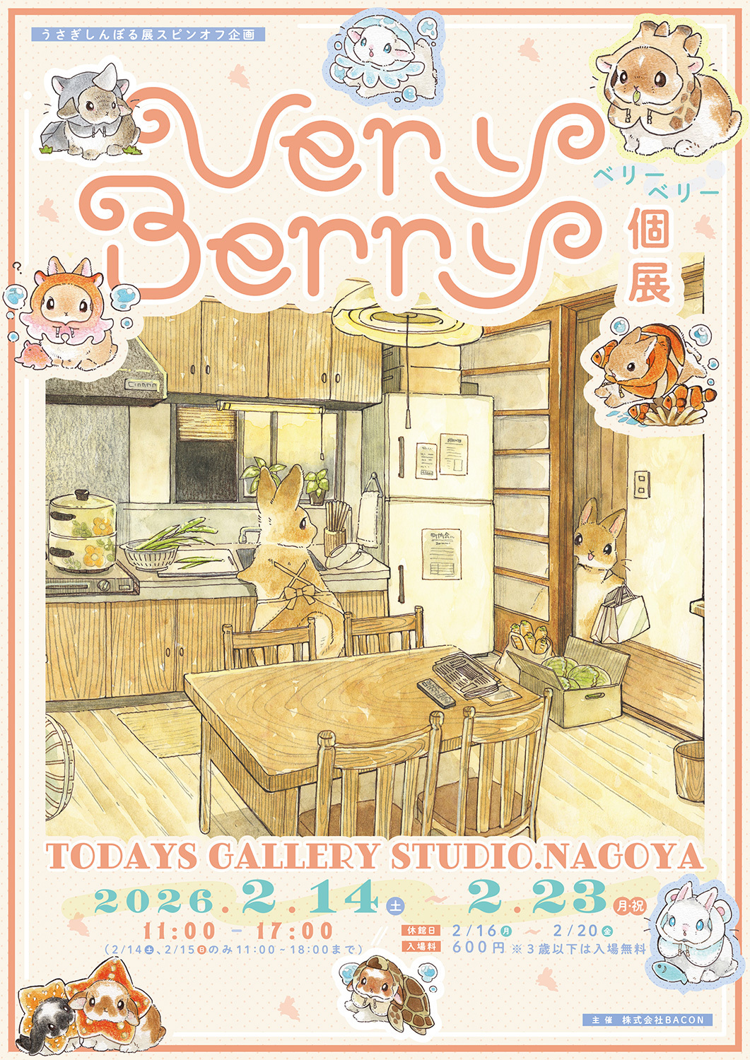 株式会社BACON(べーこん)は、見ているだけで心温まるうさぎの作品と物販を一堂に集めた「うさぎしんぼる展」のスピンオフ企画「Very Berry個展 2026」を、TODAYS GALLERY STUDIO. NAGOYA(愛知県・名古屋市)にて2026年2月14日(土)~2月23日(月・祝)の期間で開催いたします。(※2月16日(月)~2月20日(金)は休館日)