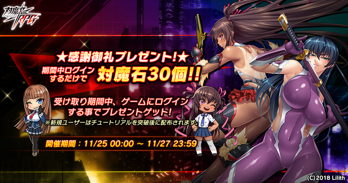 期間中にログイン頂けた方には対魔石30個プレゼントいたします!この機会に対魔忍RPGに新規登録して対魔石をGETしましょう!