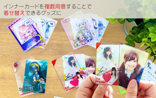 オリジナル スマホケース フォトフレームはインナーカードを複数種類制作していただくことも可能。たとえばアイドルグループやスポーツチームのメンバーごとにインナーカードを作成すれば、気分にあわせてお気に入りのカードを気軽に着せ替えできます。また、複数パターンのインナーカードをセットで販売したり、ランダム封入してコレクション性のあるグッズを制作したりするのもオススメです。