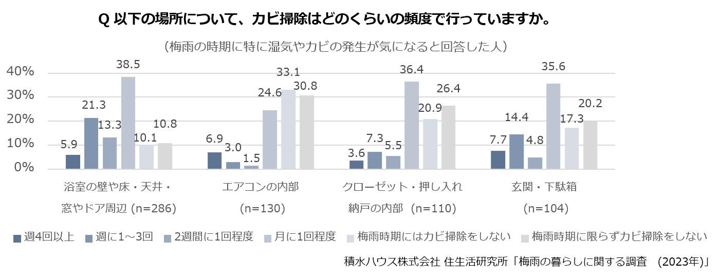 住まいの困りごと第2位は「室温や湿度の調整や管理」でした。湿度を不快に感じたり、湿度によって体感温度が上がり暑く感じたりする人もいるのではないでしょうか。それだけでなく、室温と湿度がともに高い梅雨は、特にカビが発生しやすい時期でもあります。家の中で湿気やカビの気になる場所を聞いたところ、「浴室の壁や床・天井」49.7%、「浴室の窓やドア周辺」40.2%、「洗面室・脱衣室の壁や床・天井」28.0%、「洗面室・脱衣室の窓やドア周辺」26.8%と、水回りの空間が多く挙がりました。他にもエアコンの内部や、クローゼットや下駄箱などの収納周りを回答した人も2割以上になりました。
