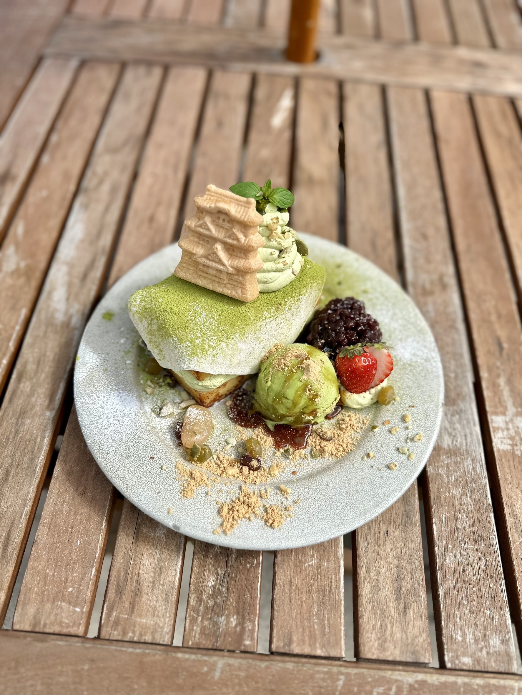 小田原の老舗「守谷のパン」の食パンをふんわり焼き上げ、足柄茶のティラミスクリーム・抹茶アイス・足柄茶ホイップなどをトッピング。小田原城のモナカがアクセントを添えた、まさに“小田原らしさ”を味わう一皿です。