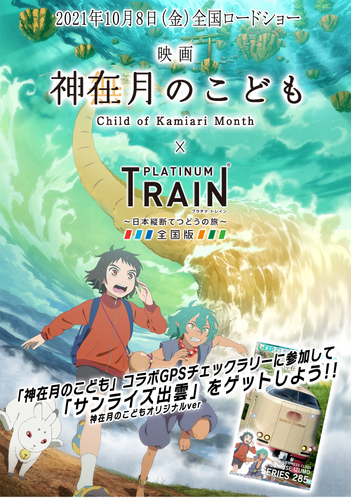 株式会社JR西日本コミュニケーションズが企画し、株式会社ジェイコンテンツが開発・運営する、スマートフォン、Nintendo Switch対応運転士成長型鉄道RPGスゴロクゲームアプリ「プラチナ・トレイン 日本縦断てつどうの旅 全国版(プラトレ)」が、2021年10月8日(金)全国ロードショーの映画「神在月のこども」とのコラボイベントを開催します。映画のテーマとなっている出雲市周辺5か所にGPSチェックポイントを設置、すべてのチェックポイントを巡ると「サンライズ出雲」神在月のこどもスペシャルバージョンが手に入ります!